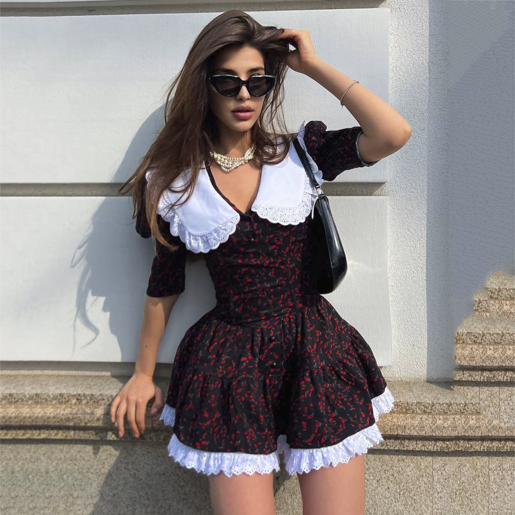 Roupas femininas de verão, gola de boneca, vestido floral de manga curta, cintura justa, saia tutu de renda, vestido de festa para clube