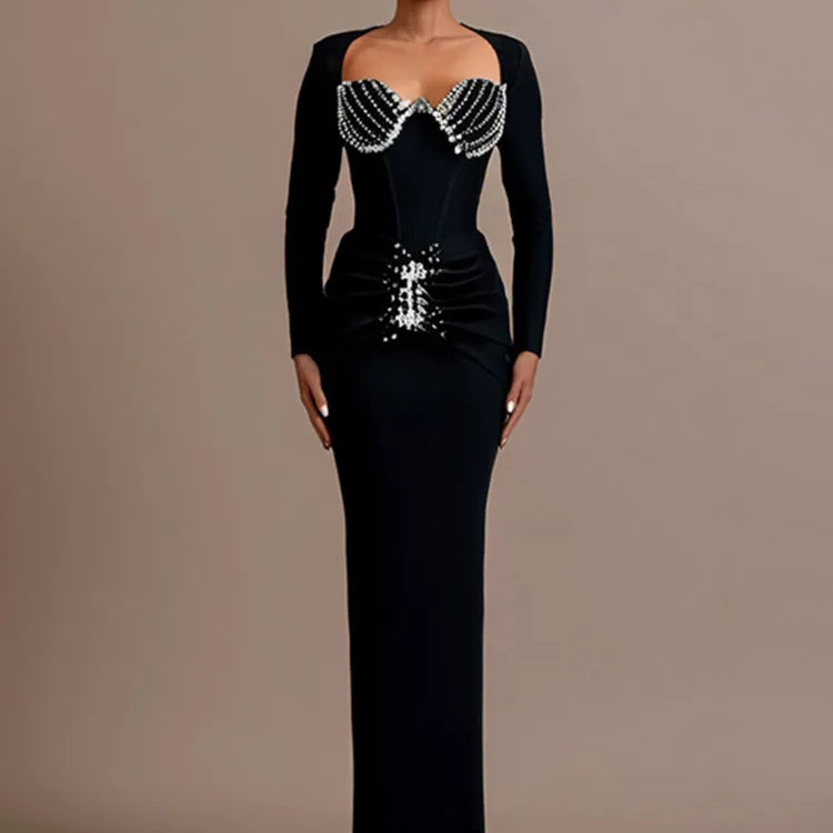 Vestido longo preto longo com babados e manga longa, celebridade, sexy, bodycon, bandagem, elegante, festa noturna, 2025