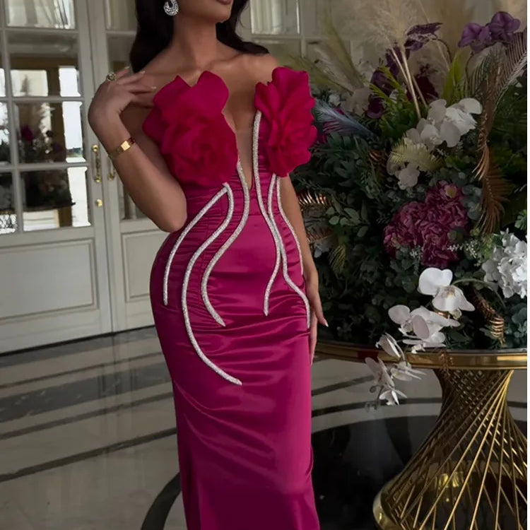 Vestido longo de bandagem rosa, sexy, sem alças, com contas e diamantes, para festa noturna, elegante, celebridade