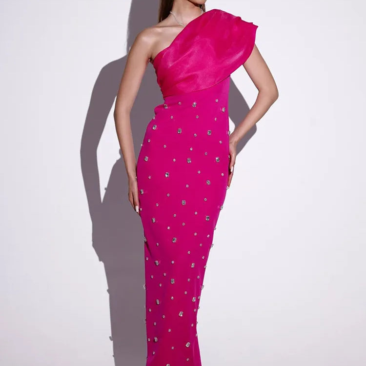 Vestido longo feminino sexy de um ombro só com losangos rosa e preto, longo, justo, elegante, para festa à noite
