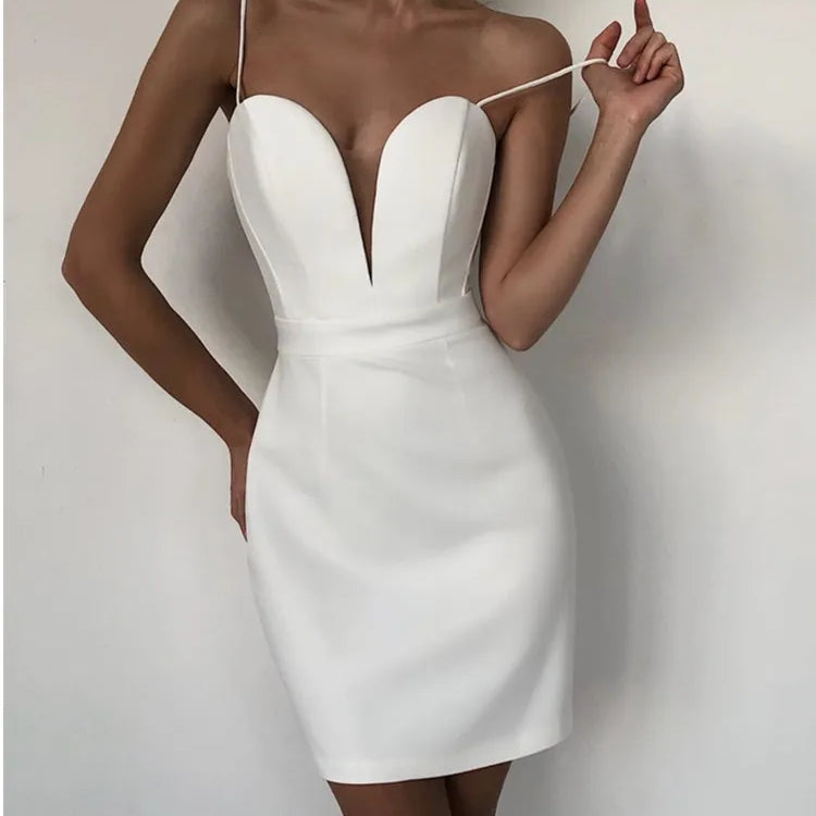 Vestido curto feminino sexy de verão, sem mangas, costas nuas, decote em V, branco, preto, de malha, justo, elegante, para festa à noite