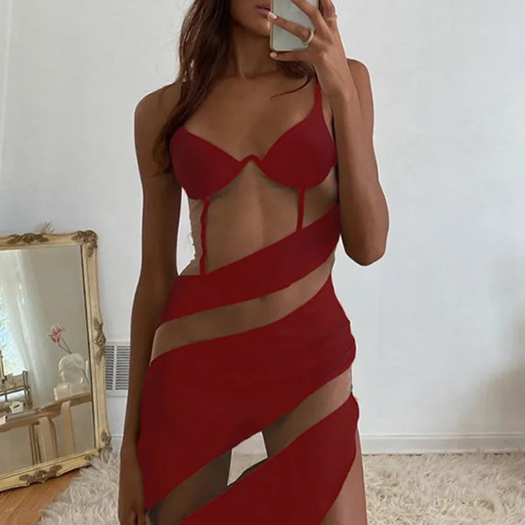 Vestido curto sexy transparente com patchwork para mulheres, robe com alças finas, sem mangas, costas nuas, justo, vestido de festa