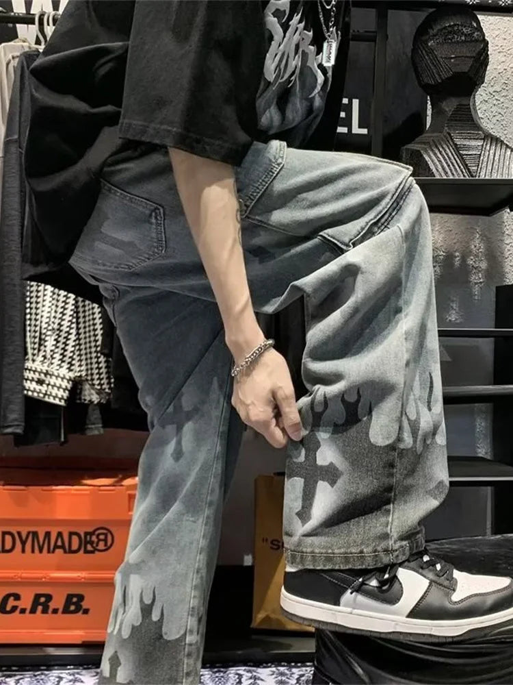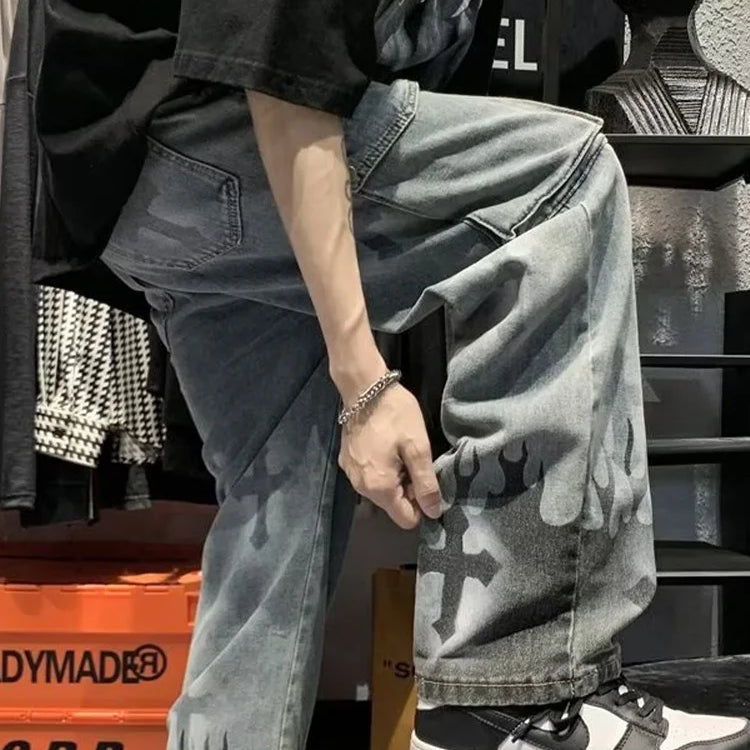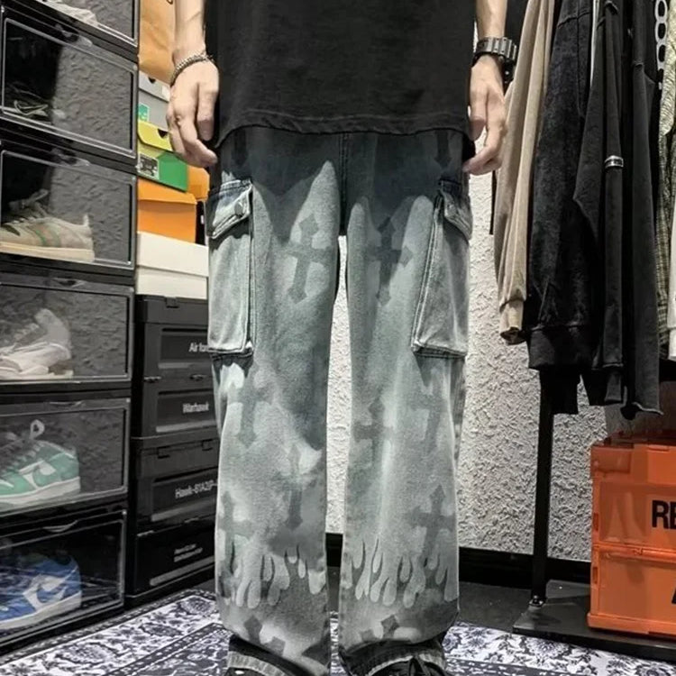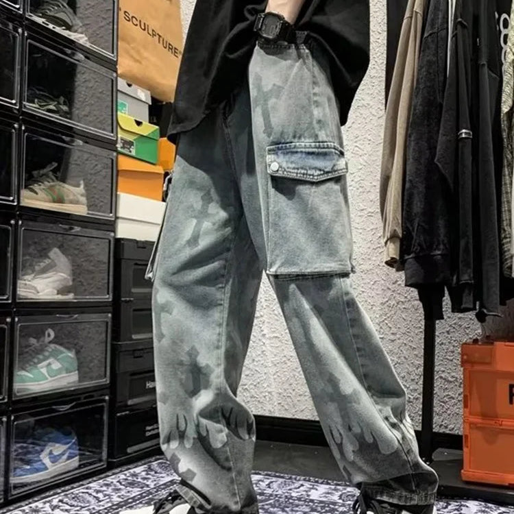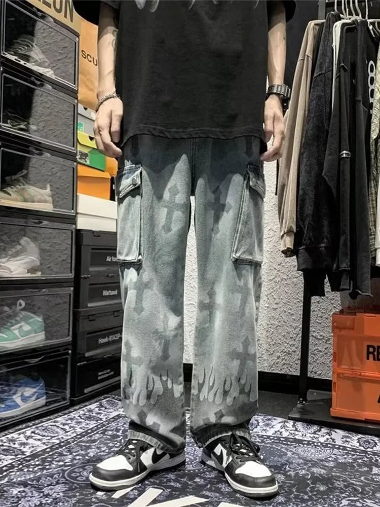 Calça jeans feminina estilo cargo, estilo hip-hop, estilo americano, gótico, punk, com estampa cruzada