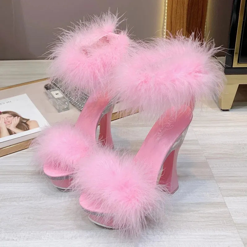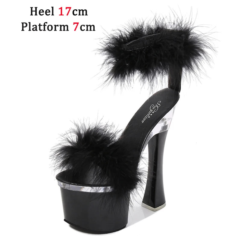 Sandálias plataforma de salto alto grosso com penas, 4 cores, mulheres, 14cm, 17cm, sapatos de salto feminino, cabelo de verão, sapatos de casamento