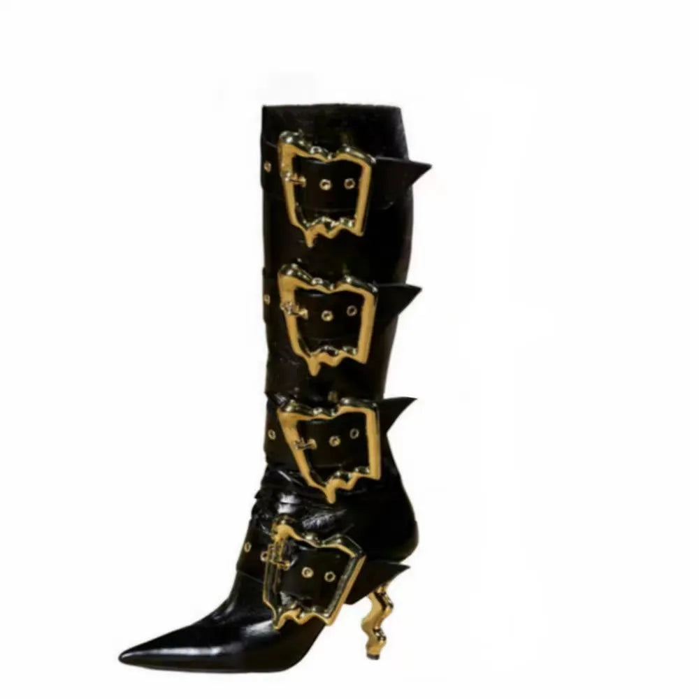 Botas de cano alto com fivela dourada para outono e inverno, elegantes, bico fino, salto alto, tamanho grande 43 44