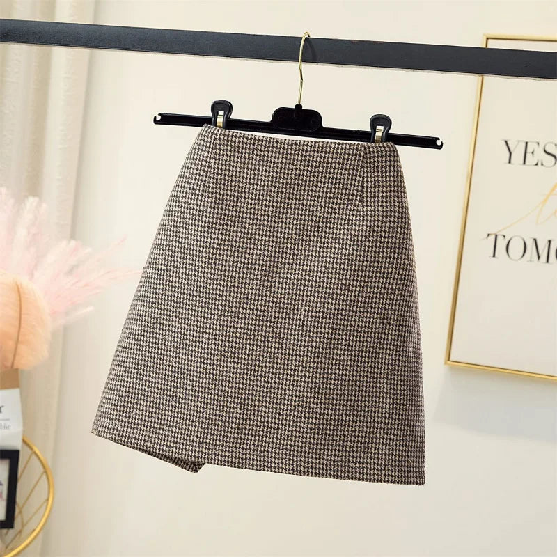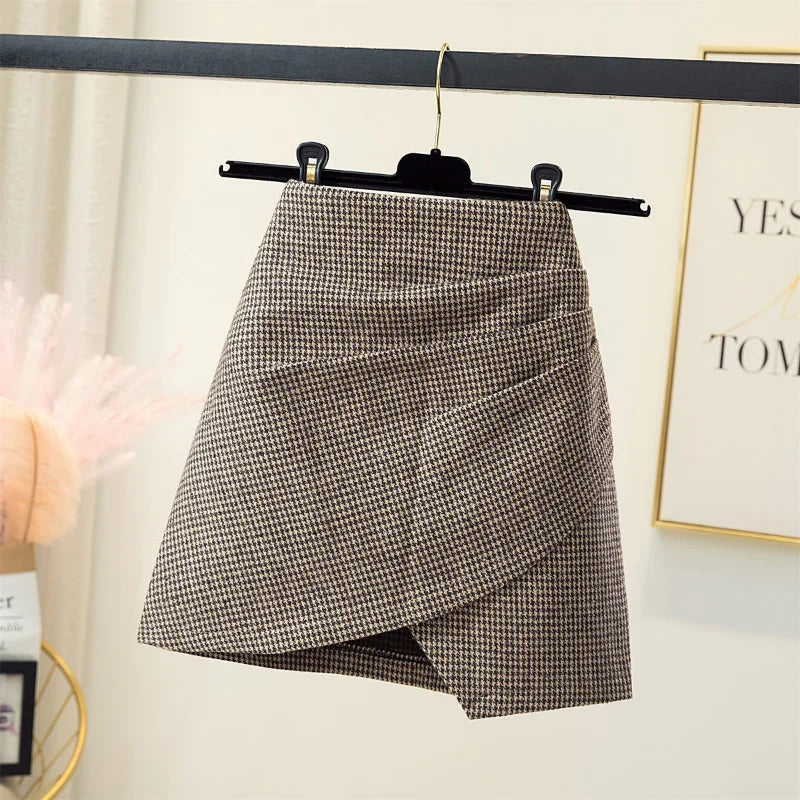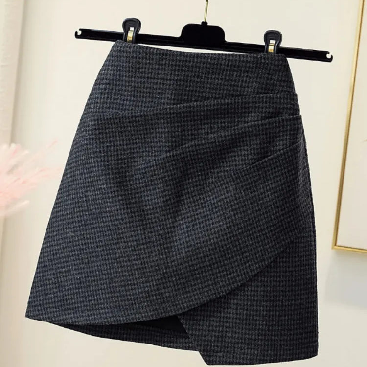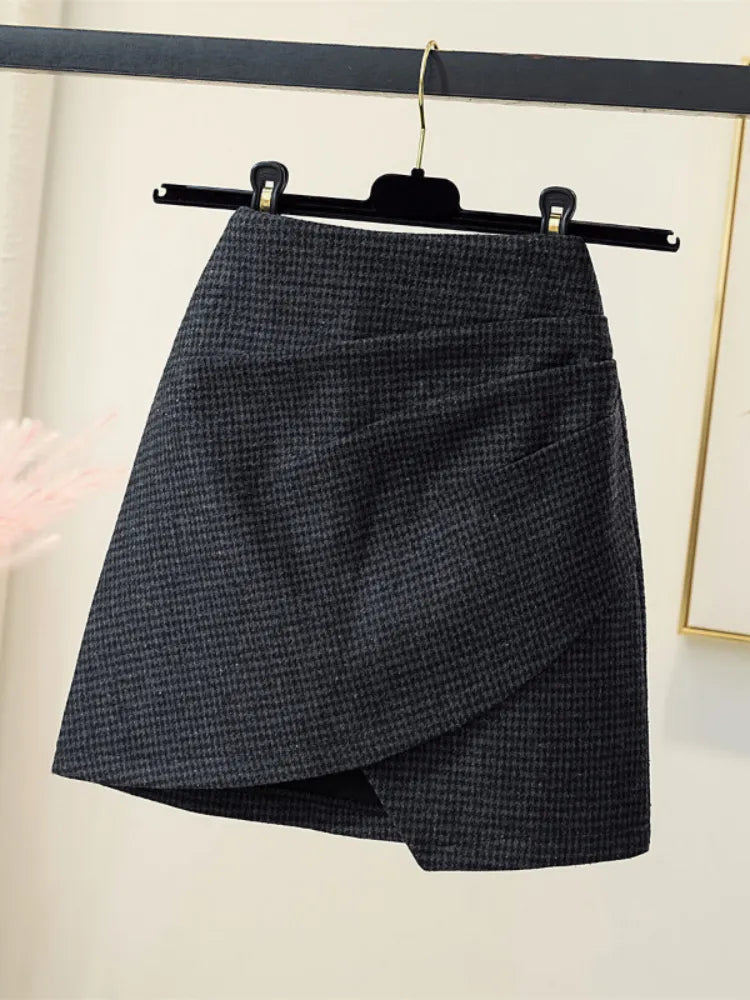 Mini saia feminina de lã pied-de-poule, cintura alta, justa e irregular, linha A, outono e inverno