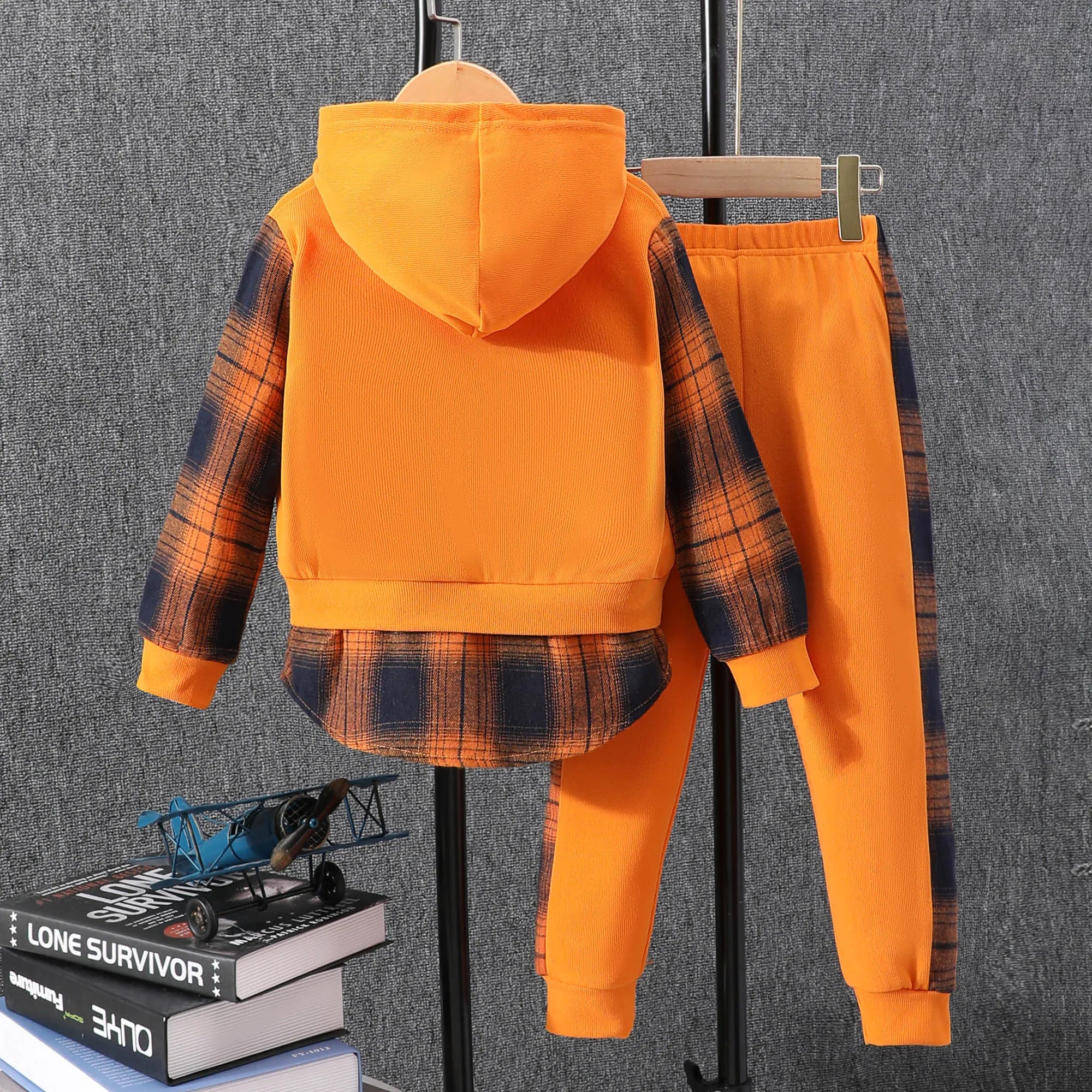 Conjunto de outono para meninos, blusa xadrez de manga comprida com capuz e calças xadrez, conjunto infantil da moda outono/inverno