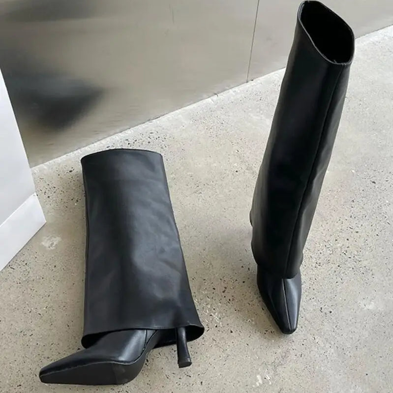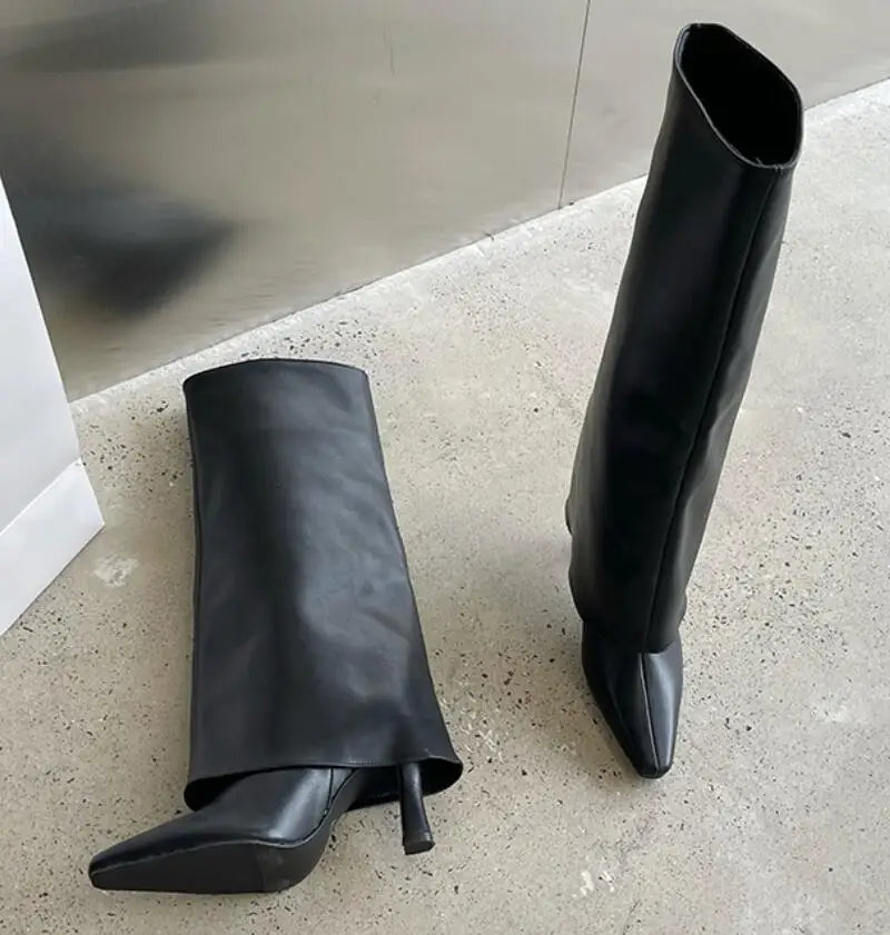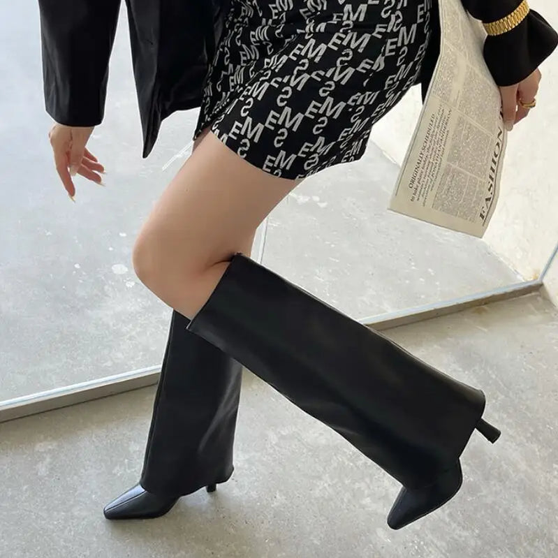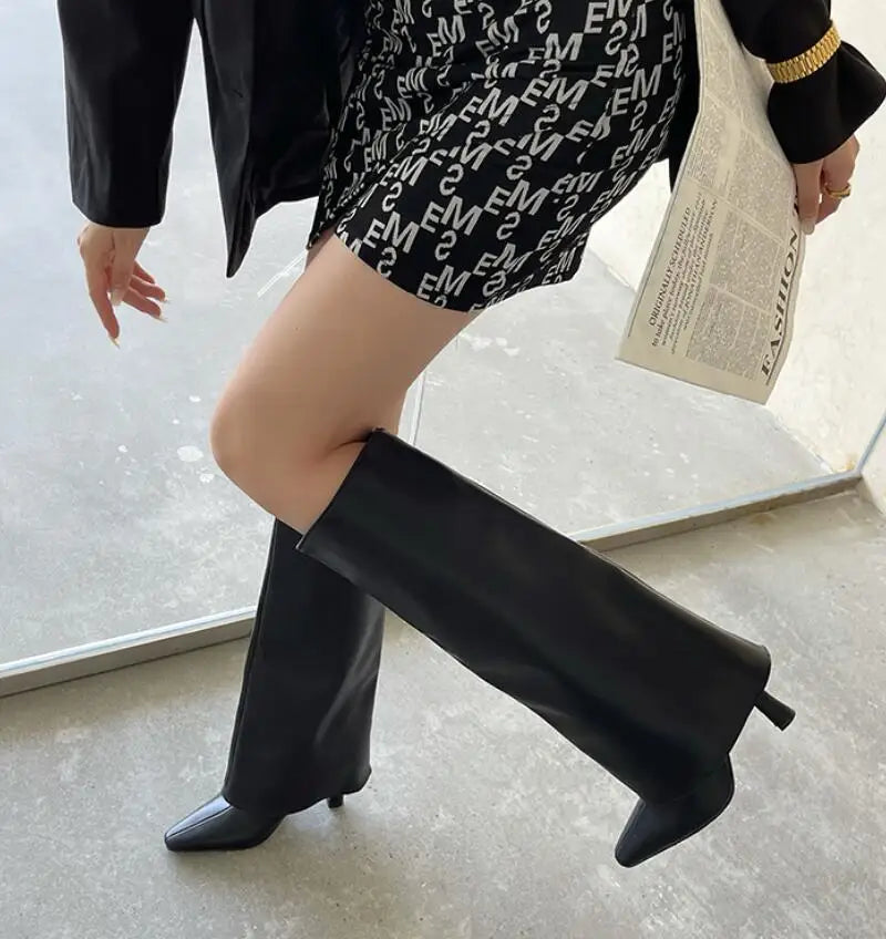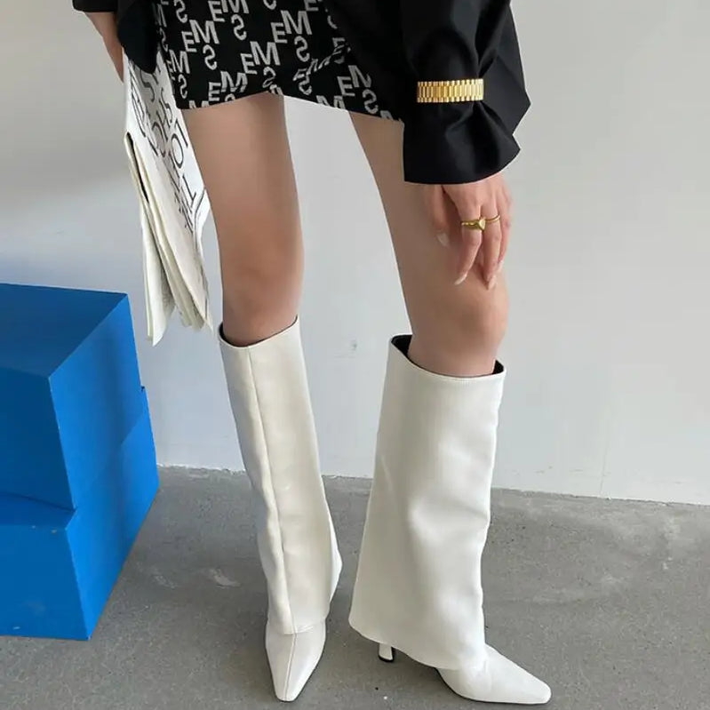 Botas femininas de marca de moda outono/inverno na altura do joelho, botas finas de salto alto e bico fino, sapatos pretos e brancos