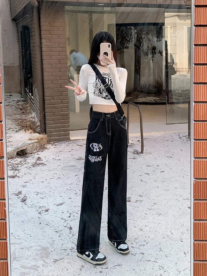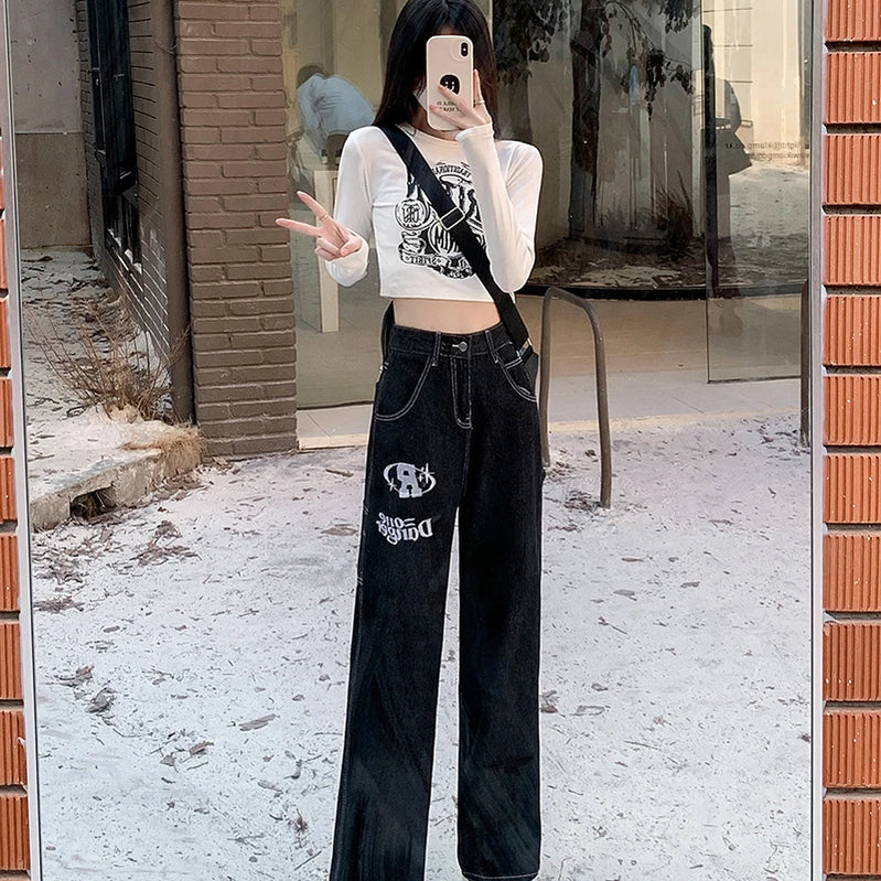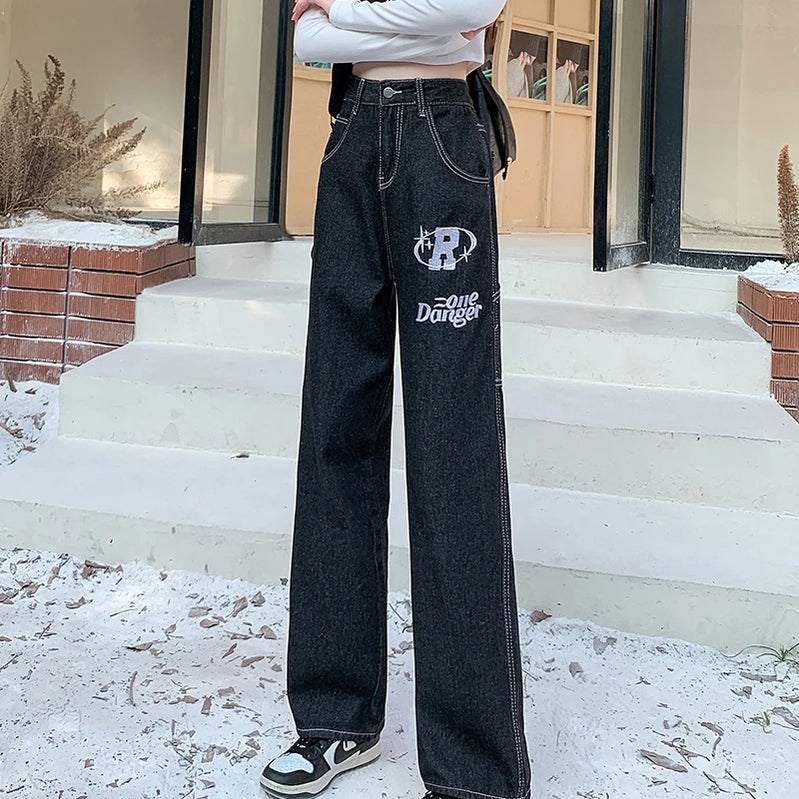 Calça jeans feminina cintura alta outono inverno, estilo americano retrô, reta, com estampa de letras, larga, para mulheres