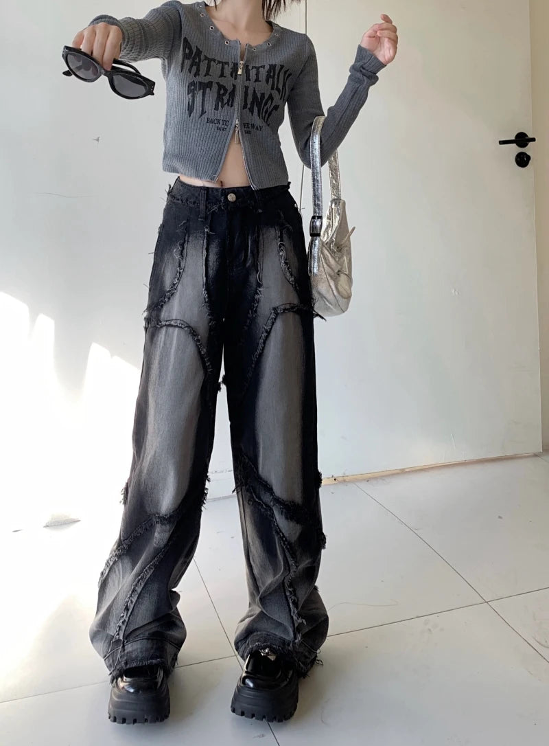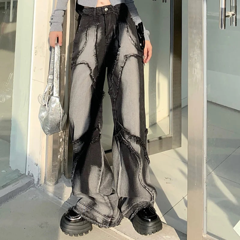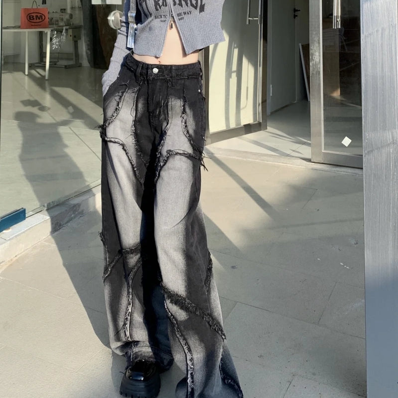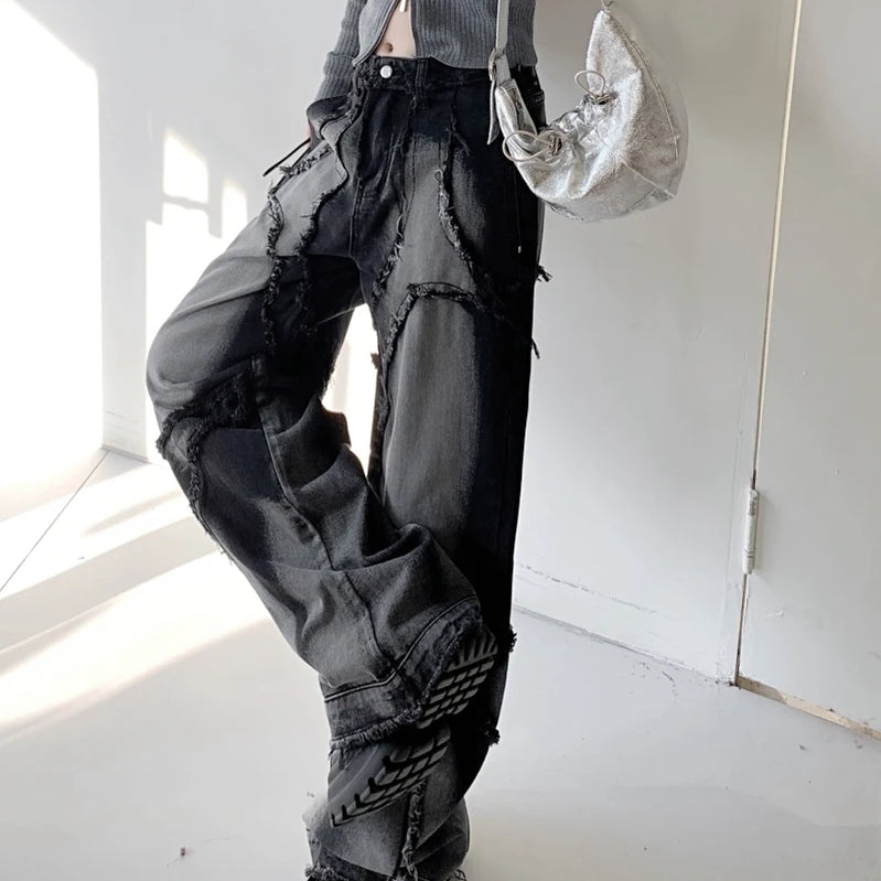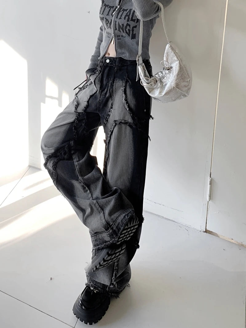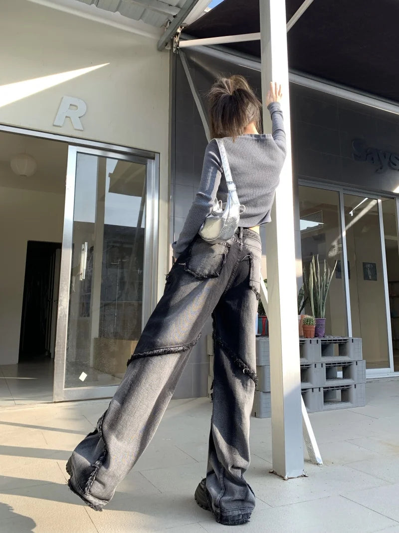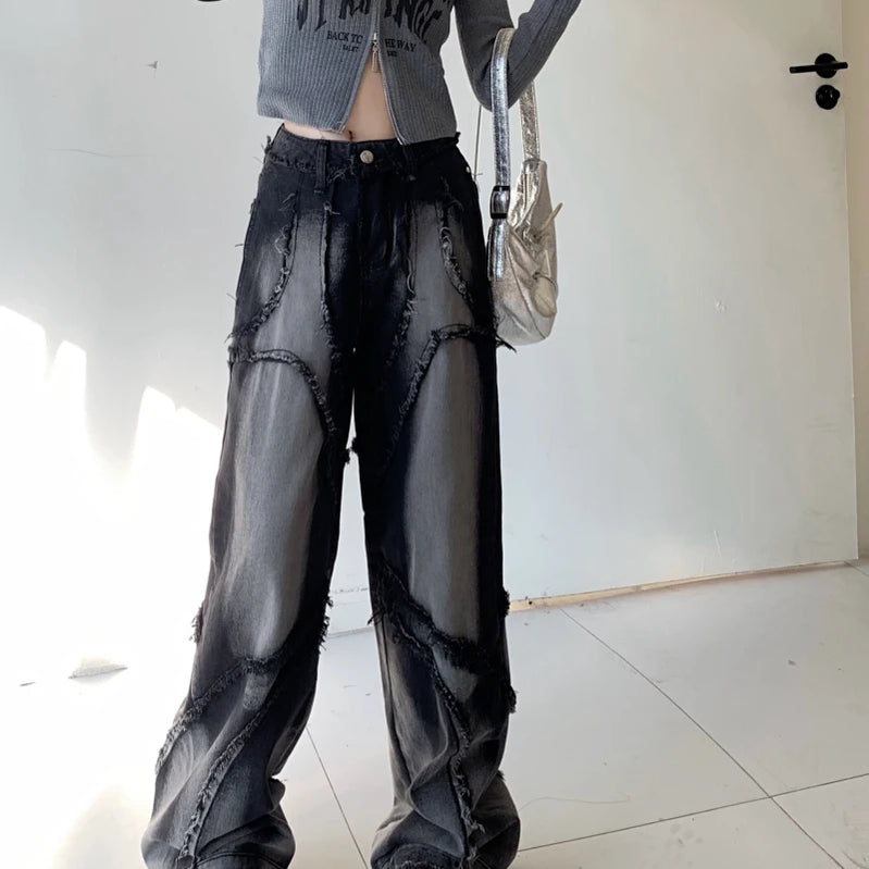 Calça jeans feminina reta, estilo tubo, para outono e inverno, estilo americano, perna larga, com borlas pretas