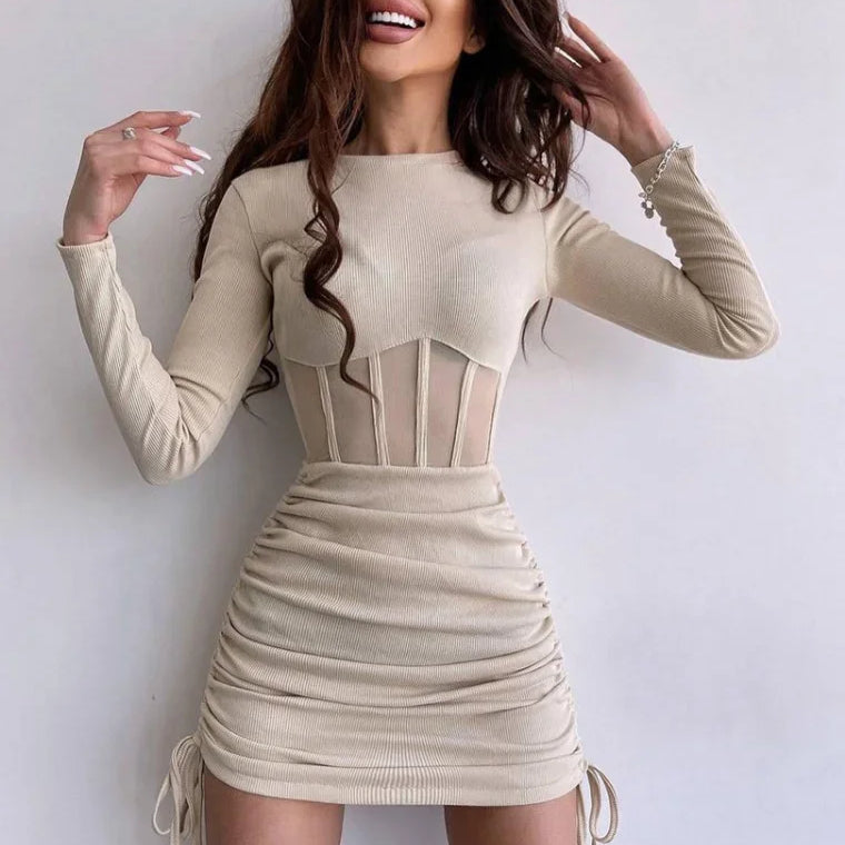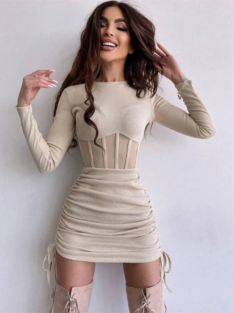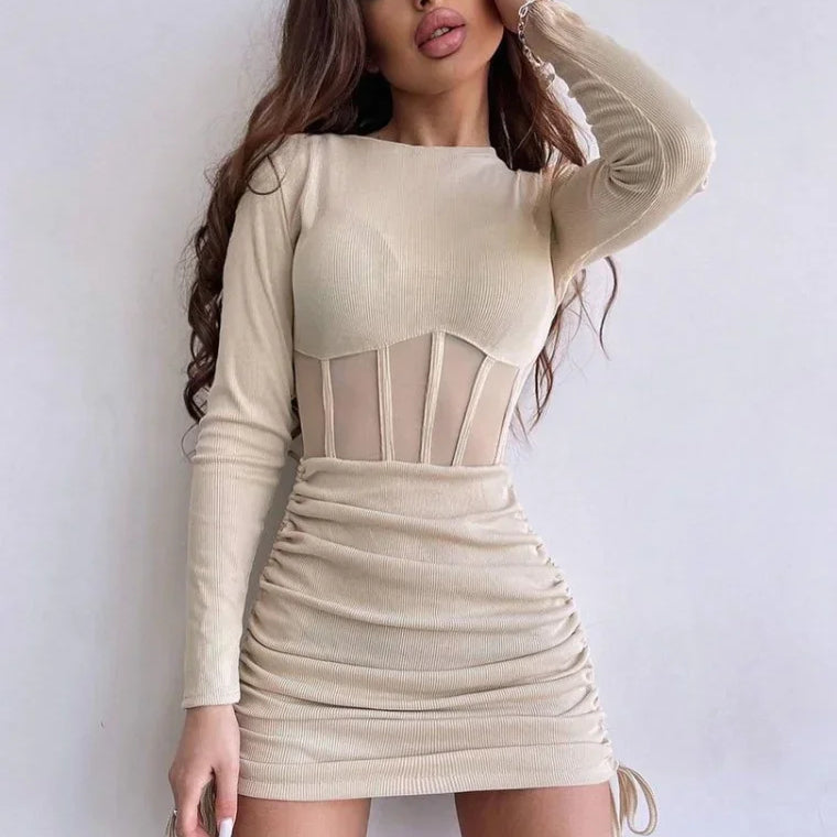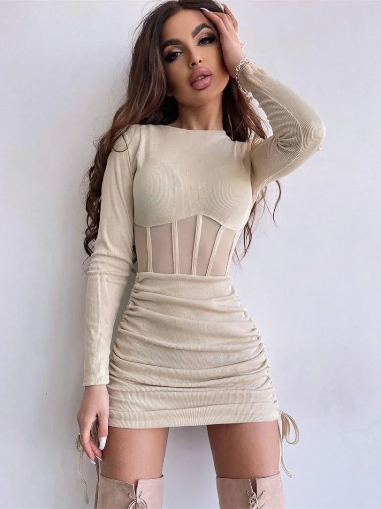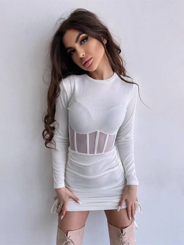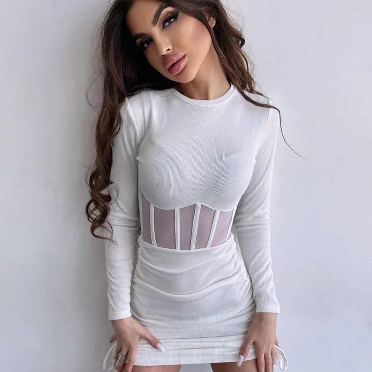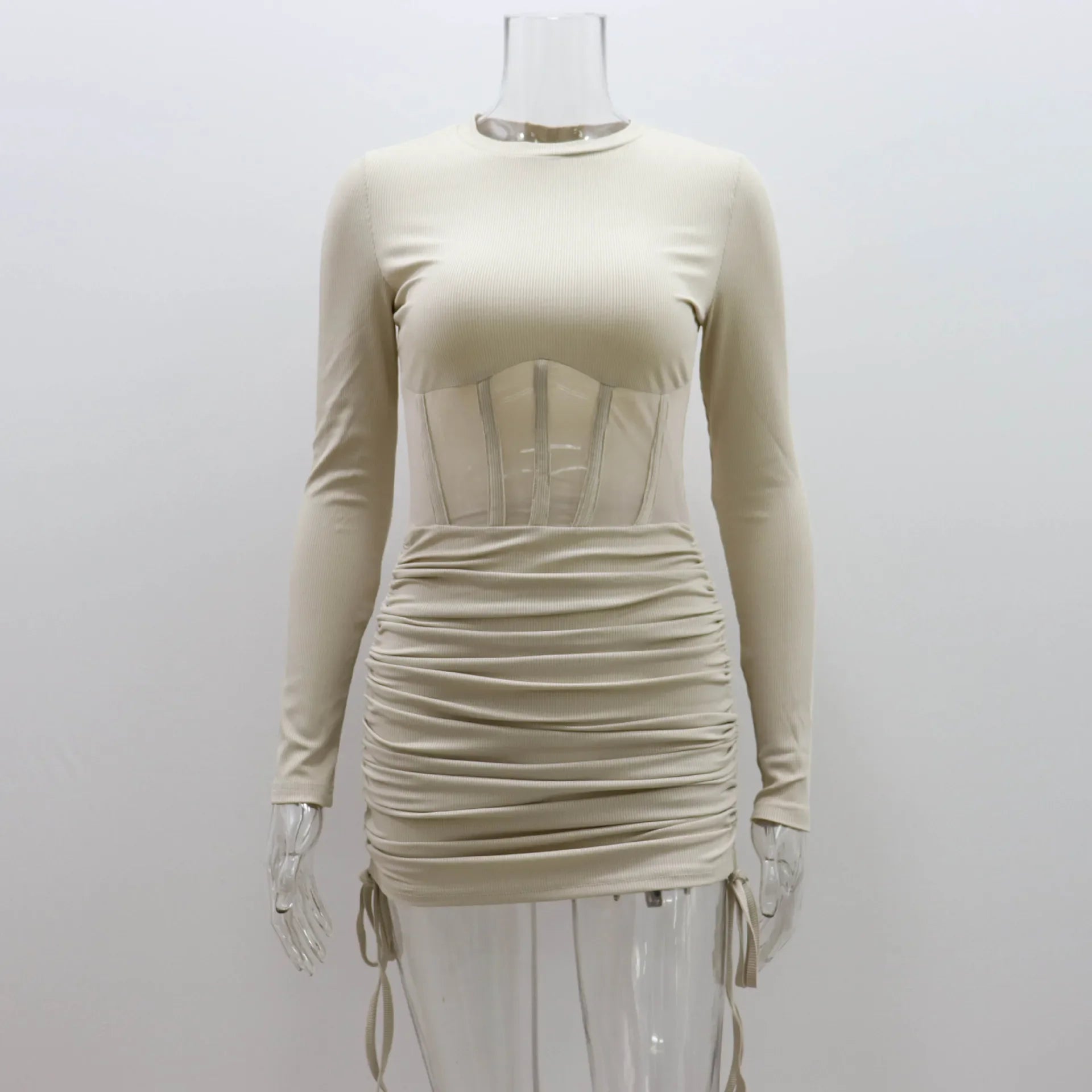 Outono inverno o-pescoço oco túnicas vestido de festa curto streetwear mulher casual sexy bodycon shirring malha espartilho vestidos