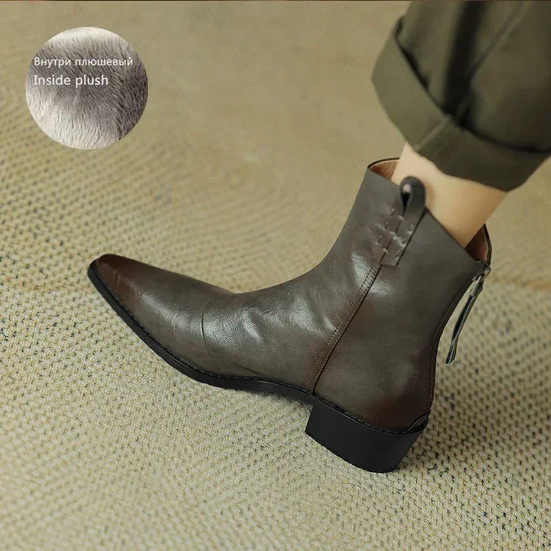 Botas femininas de couro legítimo para outono/inverno, botas estilo western, sapatos femininos, bico fino, salto grosso, botas Chelsea, botins retrô