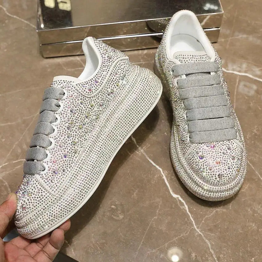 Outono feminino sapatos de plataforma strass grosso-sola branco prata sapatos brilhantes tênis de cristal tendência tênis casuais