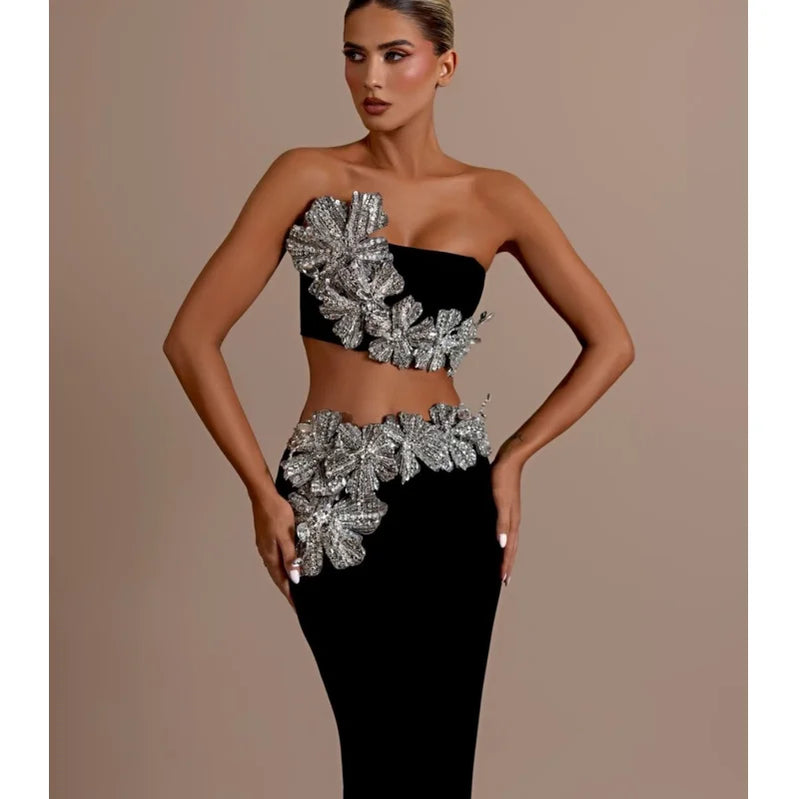 2024 Luxury Dazzling Diamond Flowers Short Strapless Top And Ankle Length Skirt 2 Pieces Woman Set Celebrity Party Vestido