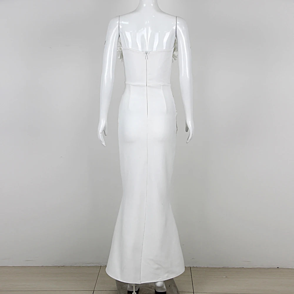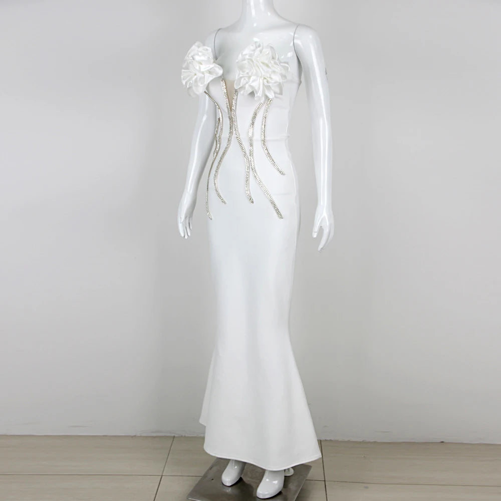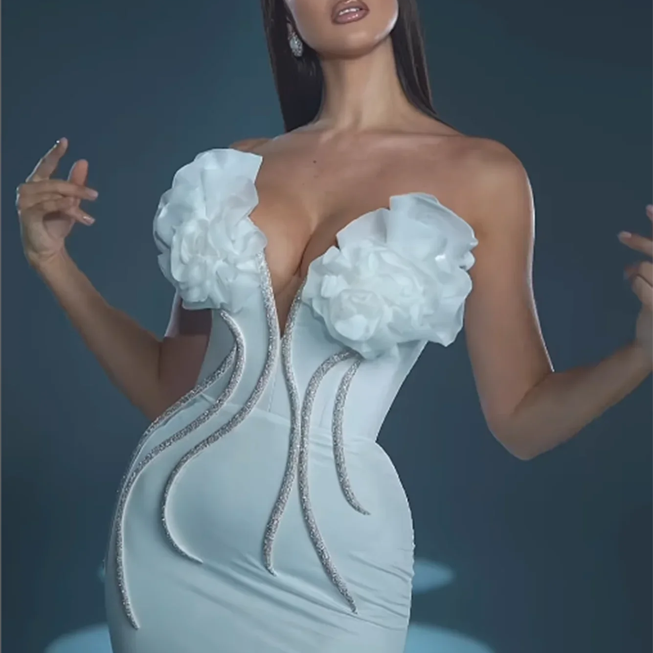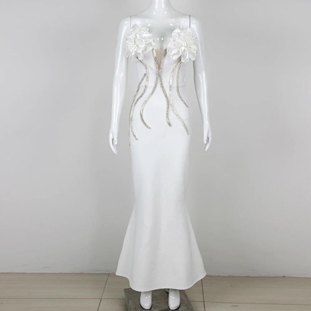 Vestido longo feminino sensual tomara que caia com flores e corrente, estilo bodycon, elegante para festa à noite, 2024