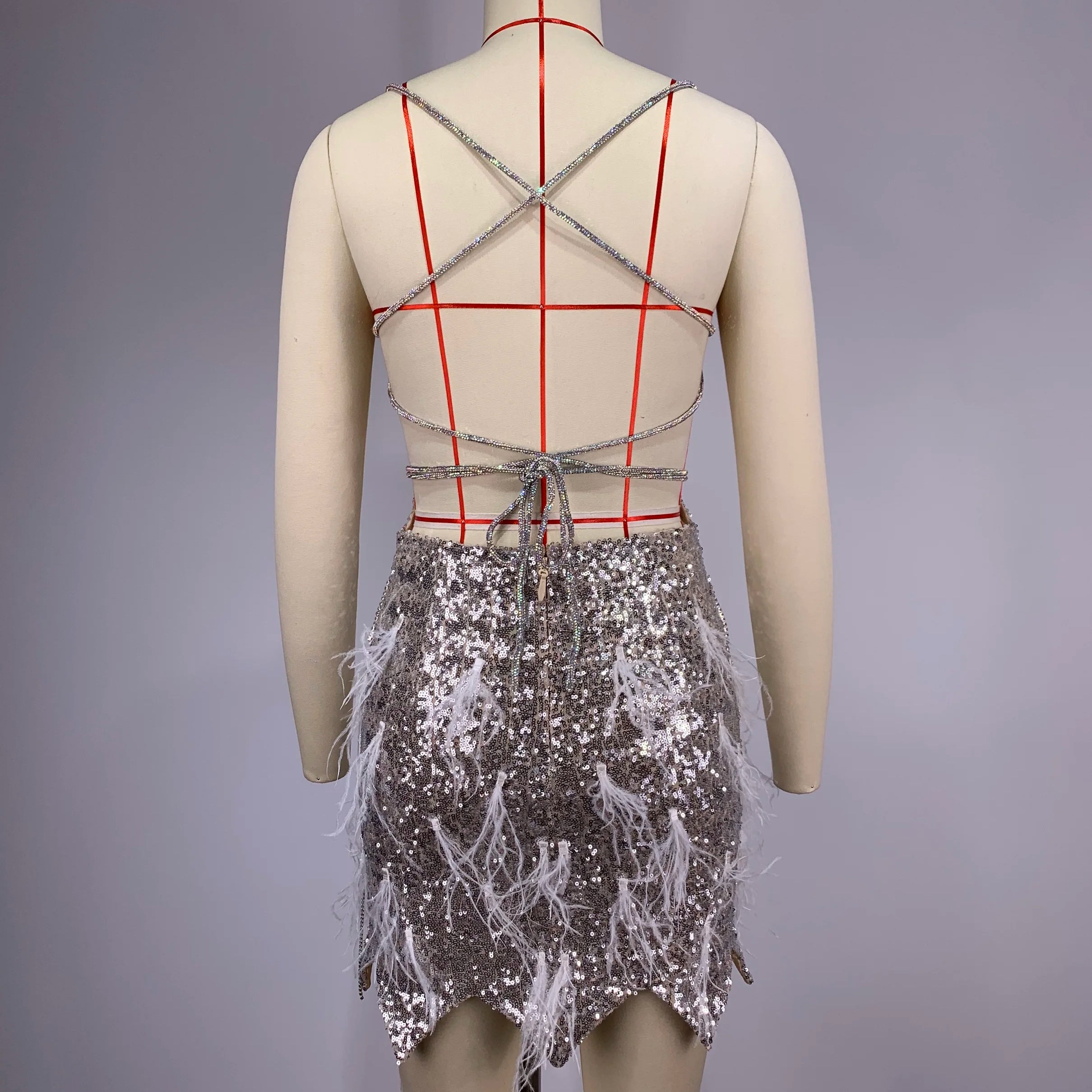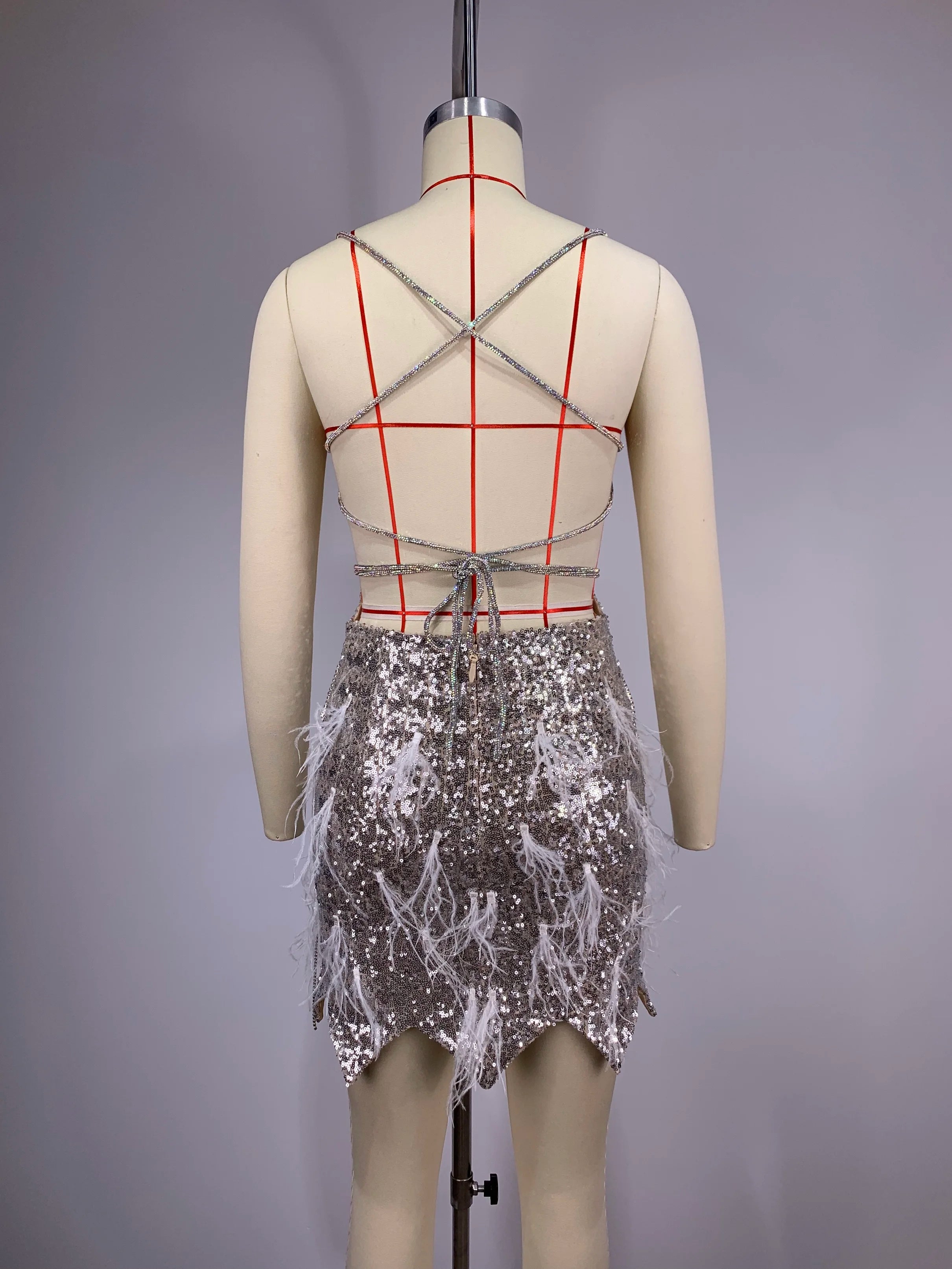Novidade 2024 Vestido curto feminino sem mangas, sexy, com decote em V, colado ao corpo, penas brilhantes, espelhos, roupa para festa de aniversário