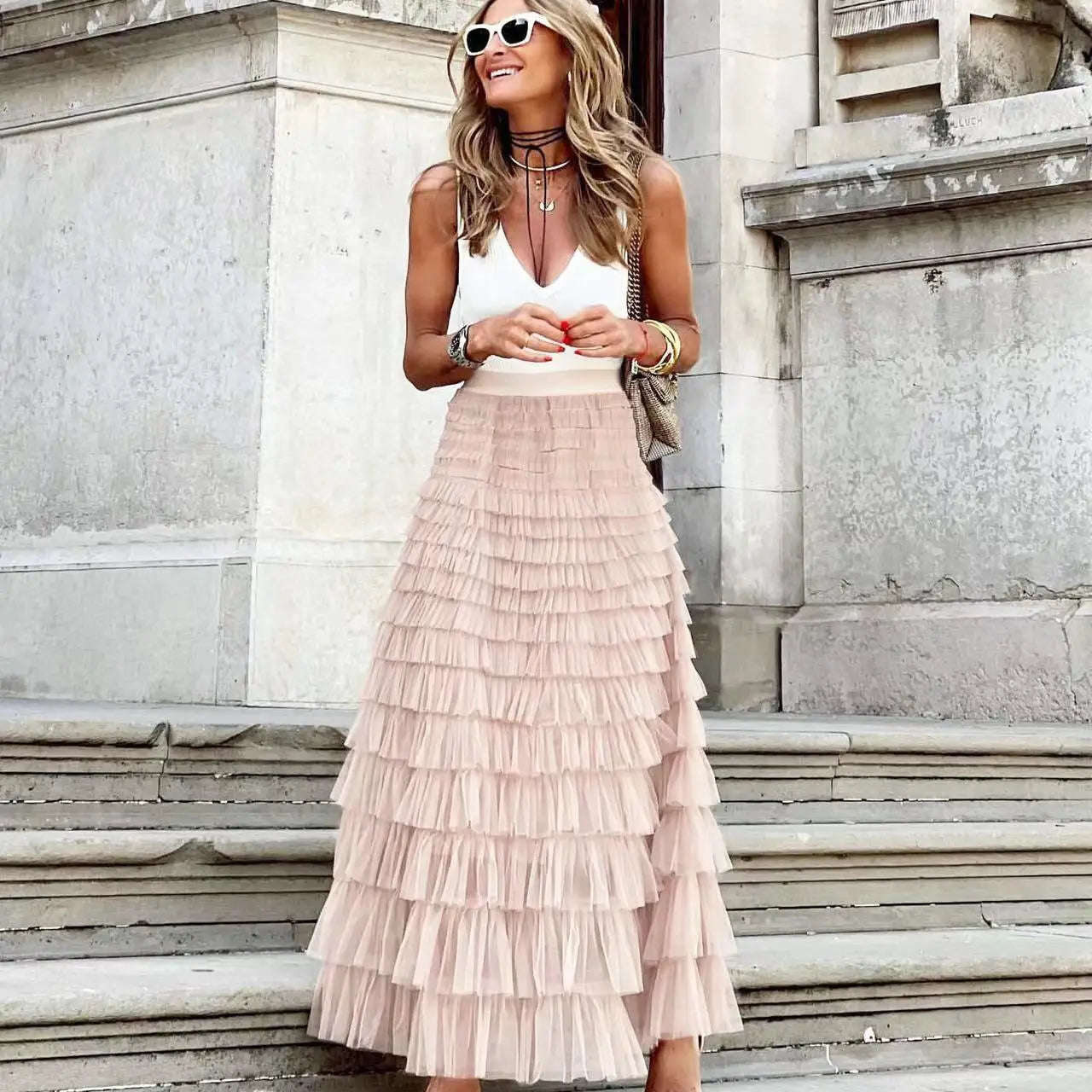 Saia longa casual feminina, lisa, de tule, cintura alta, plissada, elegante, para mulheres, malha selvagem, para encontros, maxi saias
