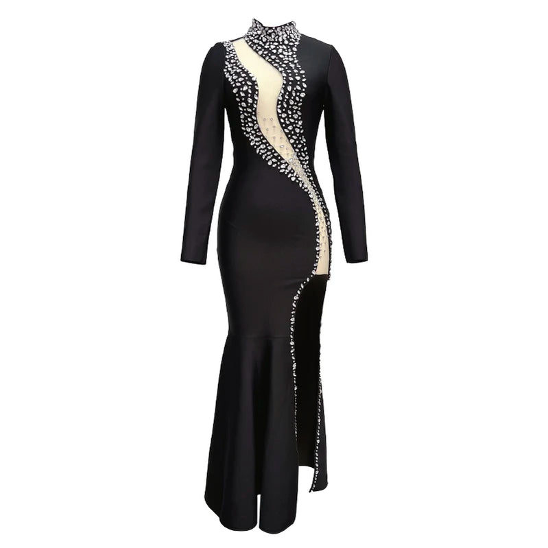 Vestido longo de bandagem colado ao corpo com fenda alta e manga longa para mulheres, primavera 2024, para festa à noite