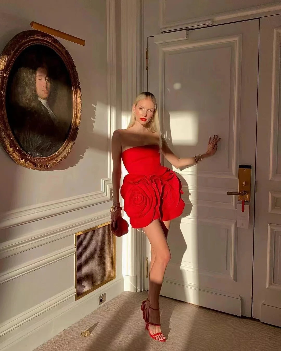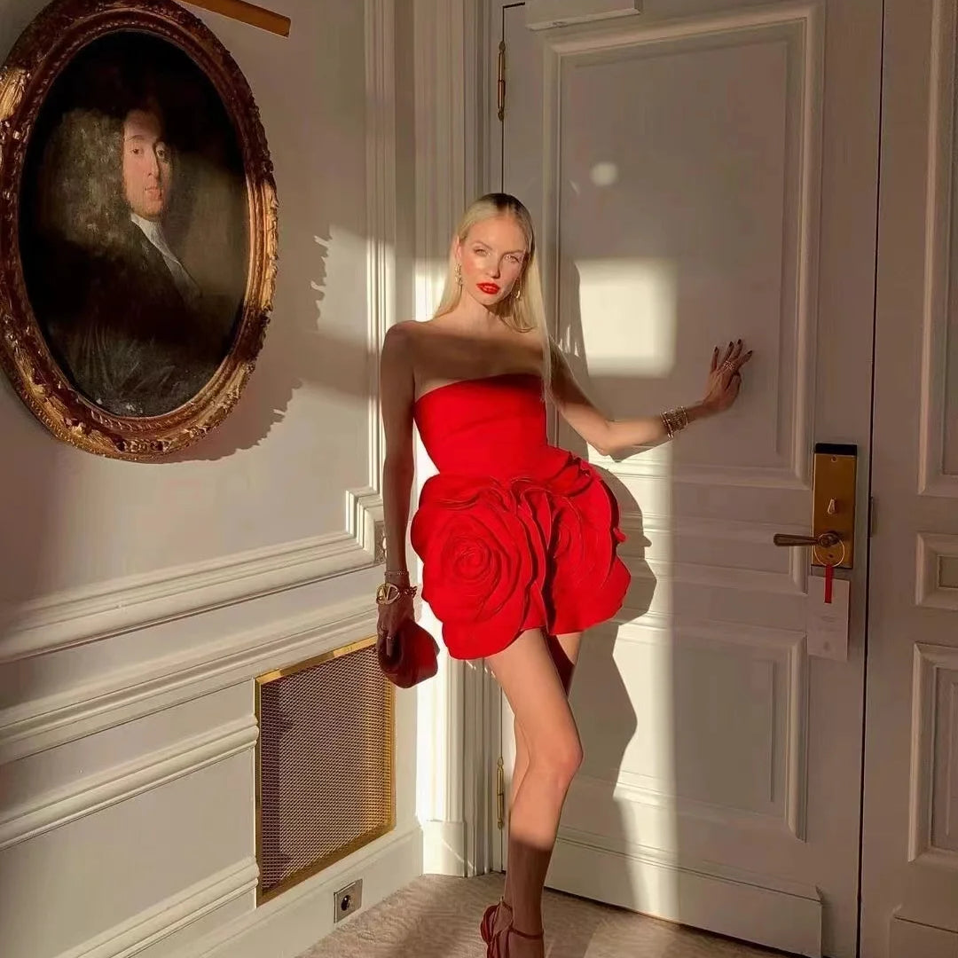 Vestido curto sexy sem alças com flores grandes e colado ao corpo, novo vestido de primavera 2024 para mulheres, fofo, celebridade, festa de aniversário, vestido de baile para meninas