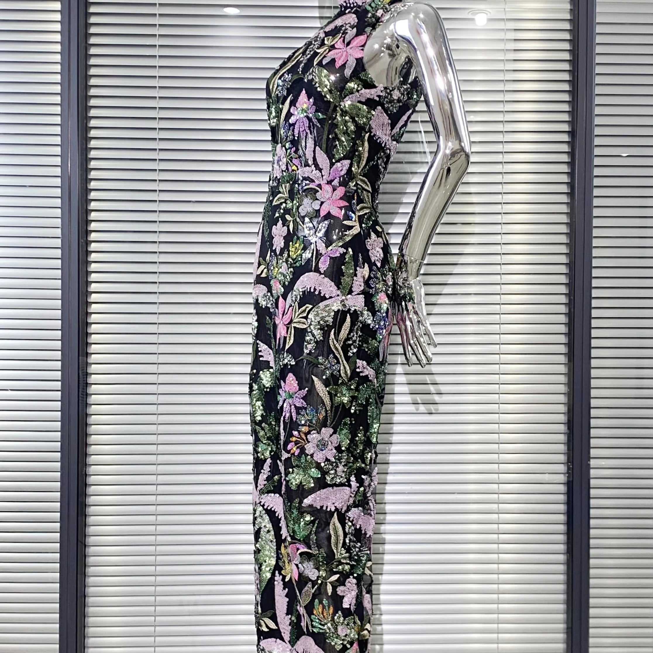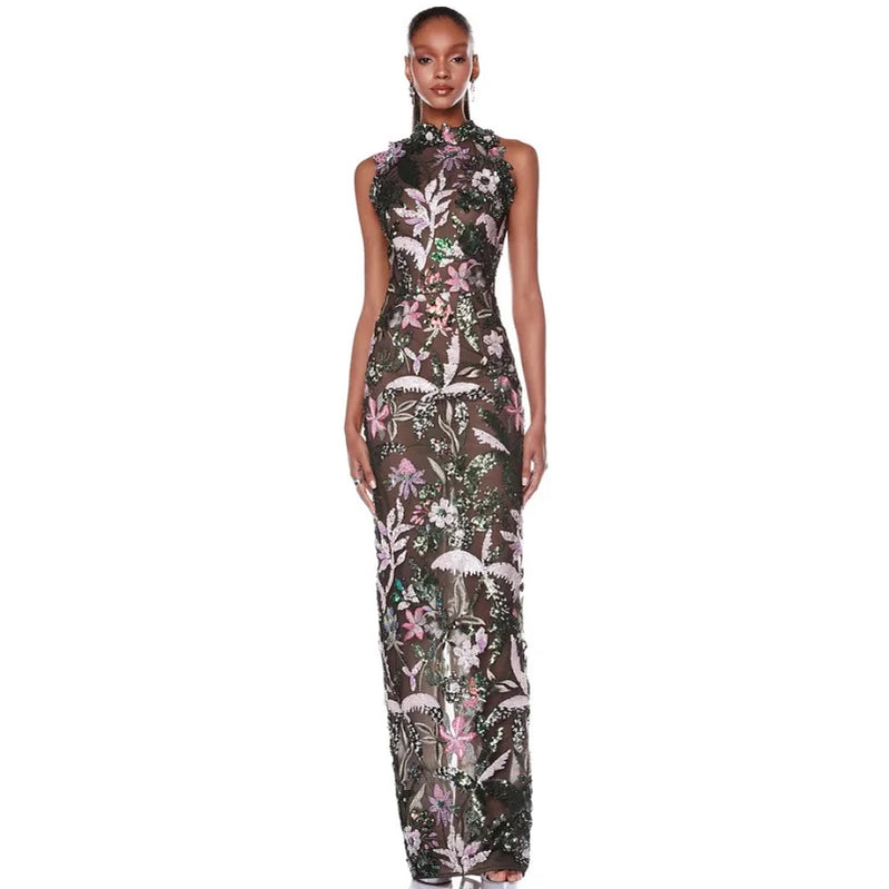 2024 Sequin Flowers Embroidery O-Neck Sleeveless Sheath Ankle Length Dress Gracful Woman Evening Dress Celebrity Party Outfit