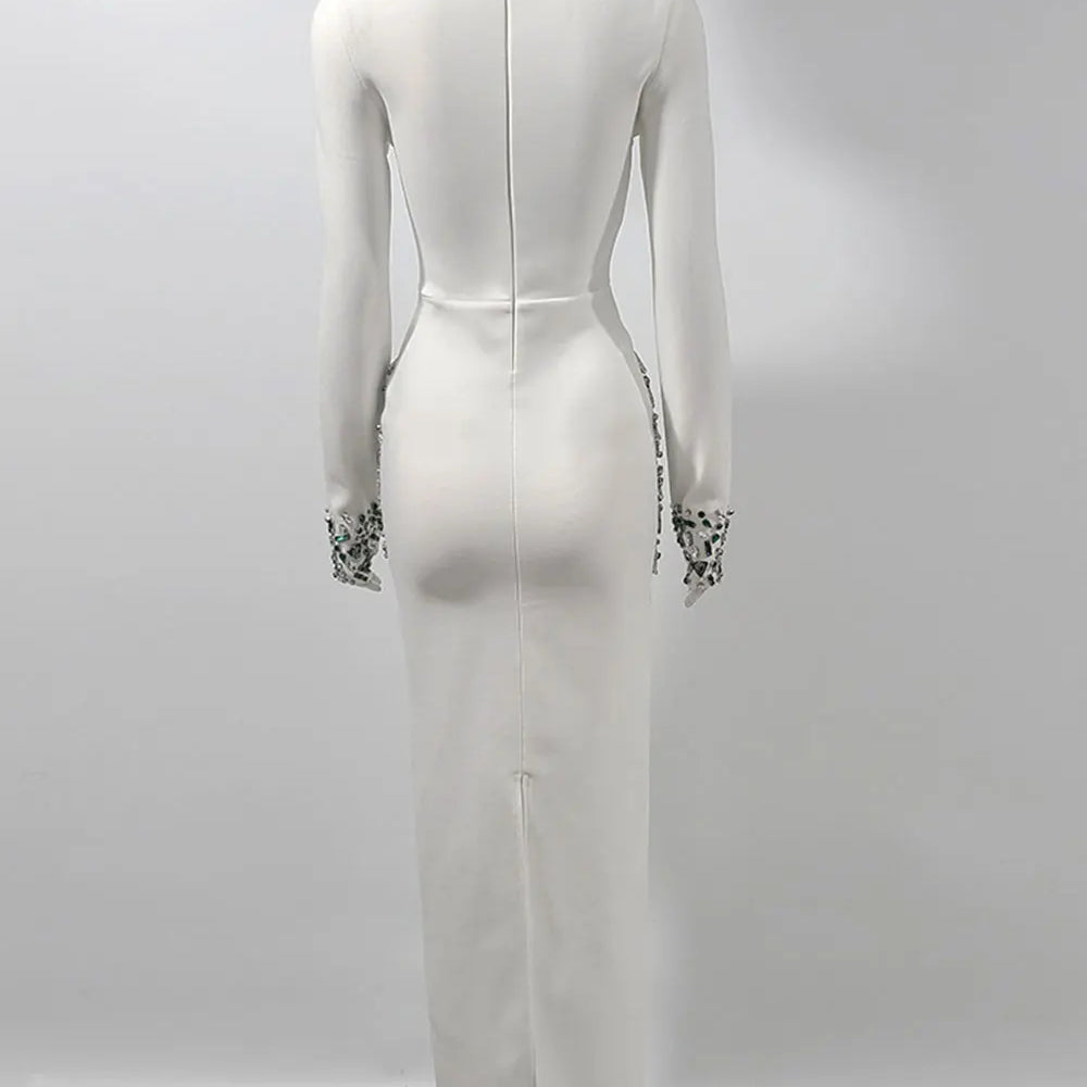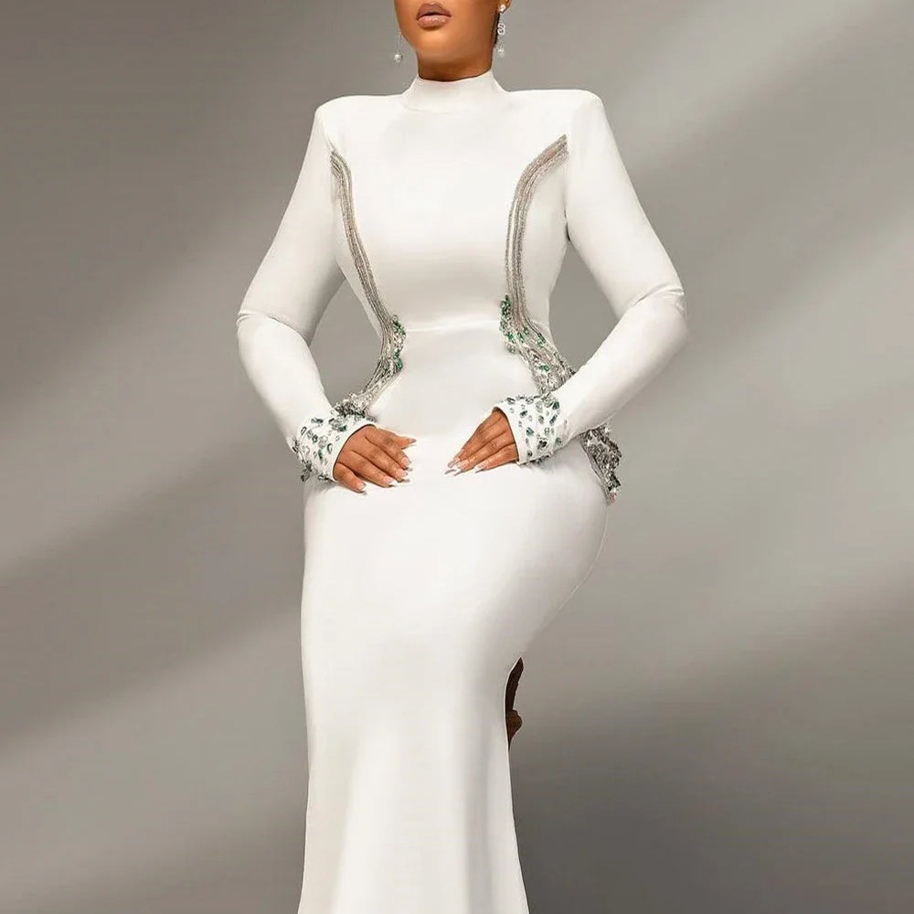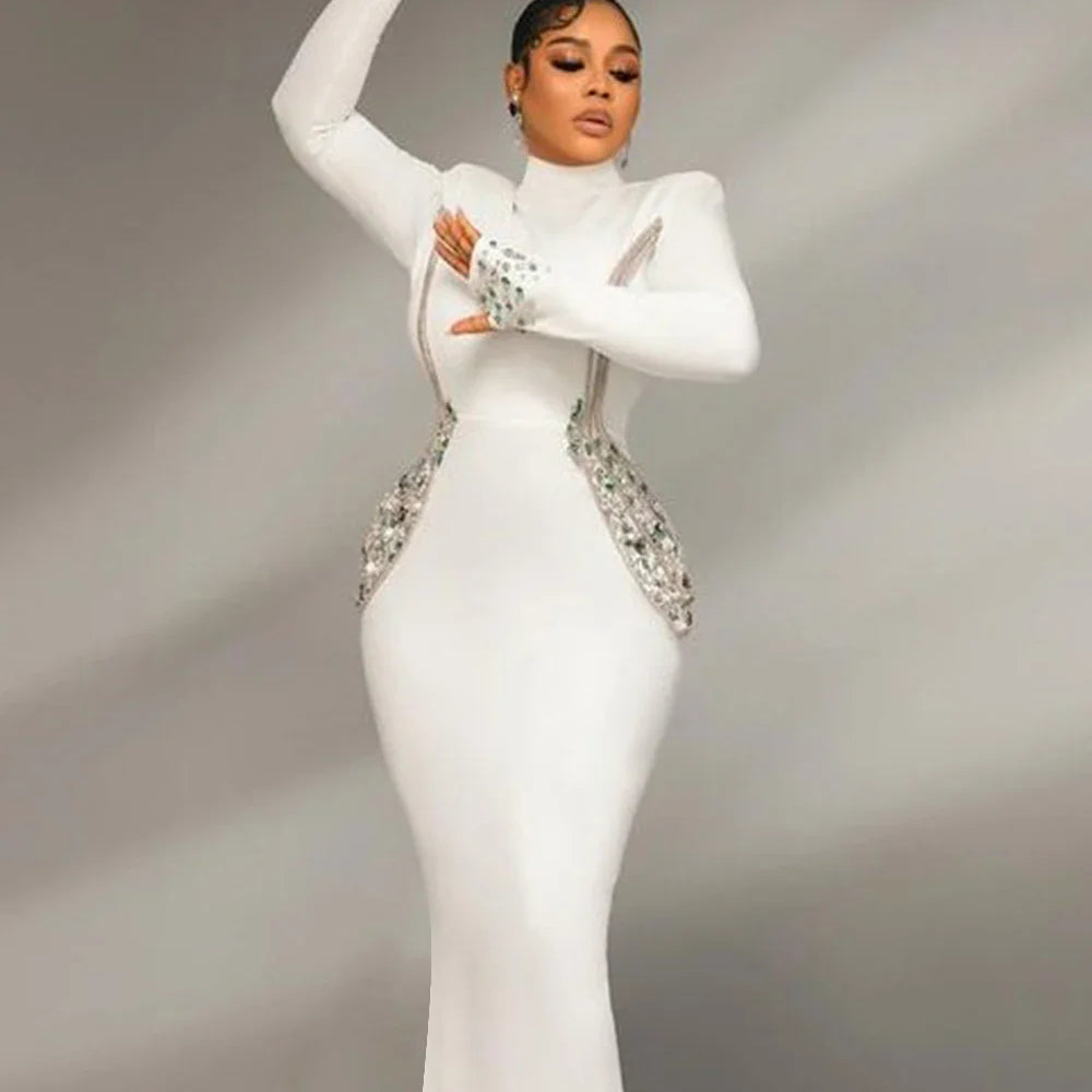 2024 Sexy Women's Heavy Industry Beaded Bandage Dress Bodycon Stand Collar Long Sleeve Midi Dress Cocktail Evening Party Vestido
