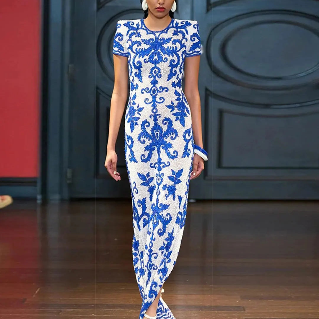 Vestido feminino estampado estilo bandagem, moda verão 2024, sexy, manga curta, gola redonda, estilo chinês, vestido longo, elegante, vestido de festa