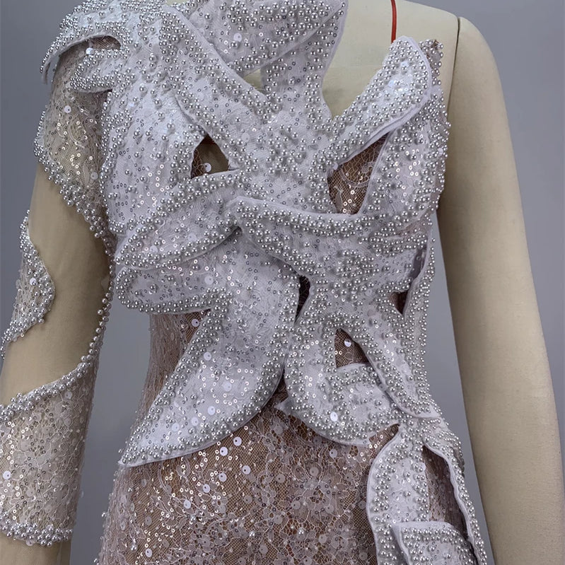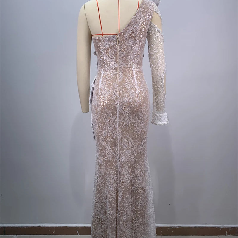 2024 White Sequins Beading One Shoulder White Lace Long Dress Graceful Woman Wedding Party Dress Singer Performance costume