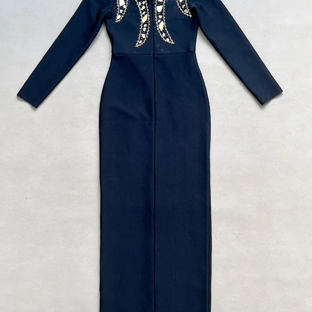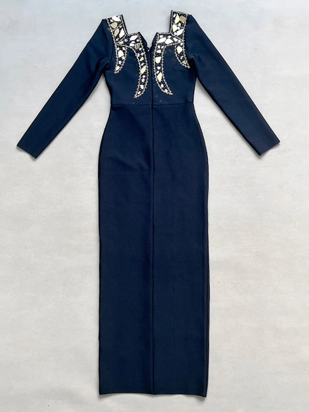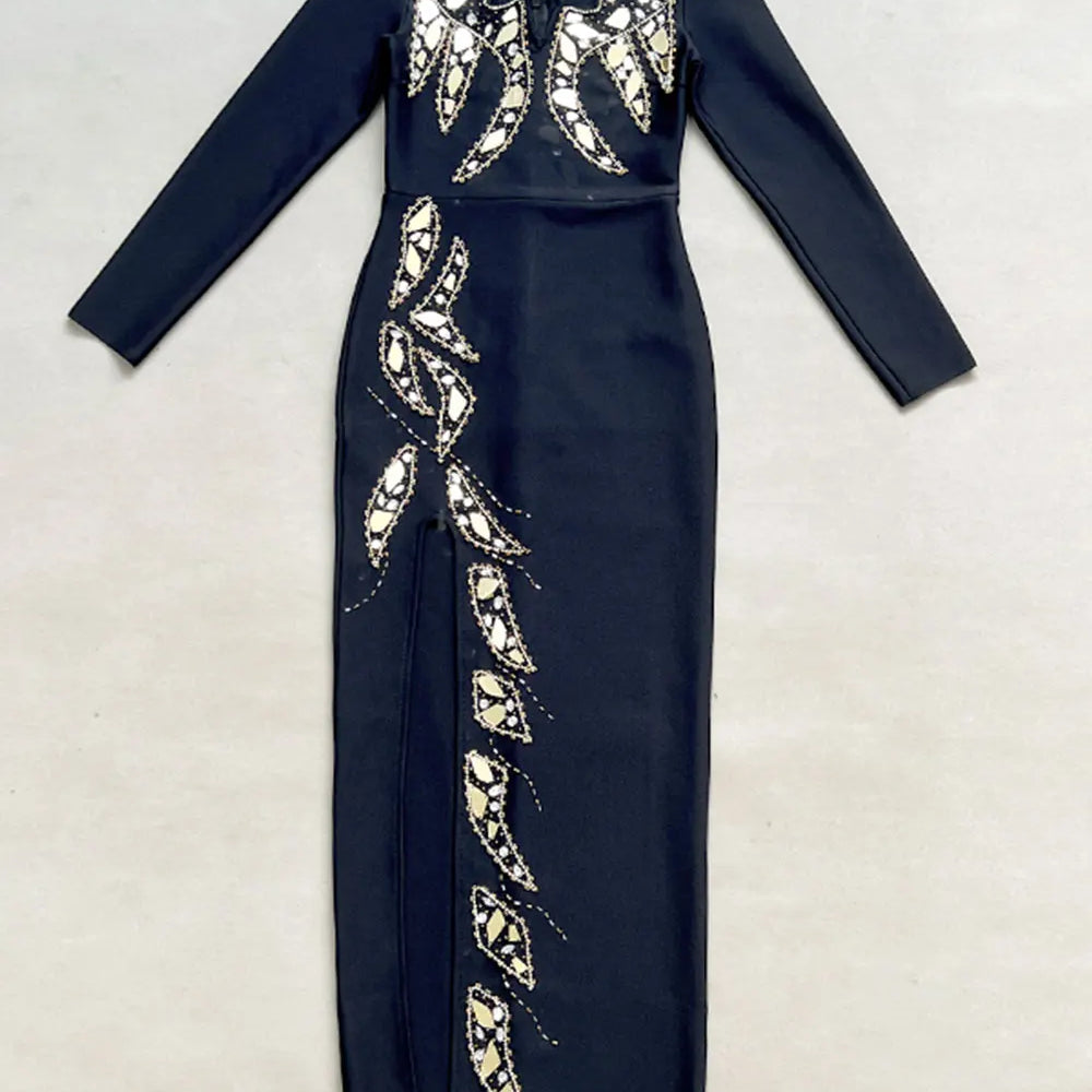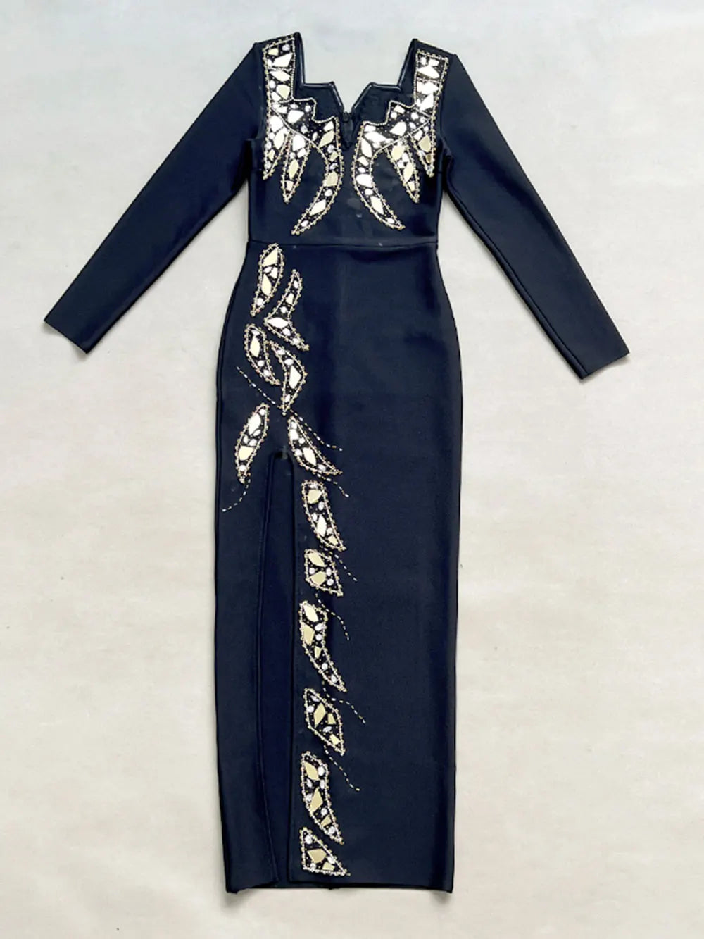 2024 Women's Heavy Industry Nail Bead Design Bandage Dress V-neck Long Sleeve Bodycon Split Length Dresses Club Party Vestido
