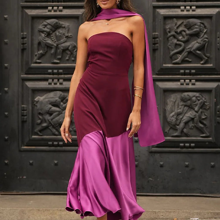 Vestido longo chique roxo com gola xale e ombros de fora, moda 2025, contraste, bainha plissada, costas nuas, robe feminino, novos vestidos de festa