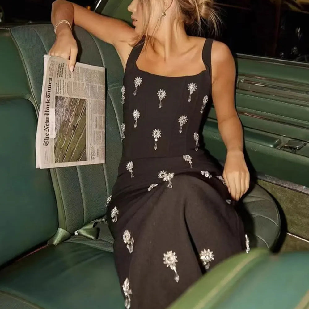 2025 Elegant Women Light Luxury Nail Bead Bandage Dress Camisole Square Neck Sleeveless Bodycon Long Dress Evening Party Vestido