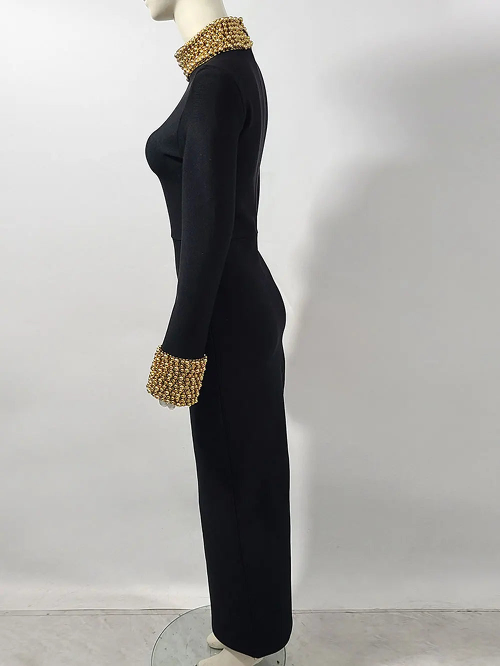 2025 Elegant Women Light Luxury Nail Bead Design Bandage Dress High Collar Long Sleeve Bodycon Long Dress Evening Party Vestidos