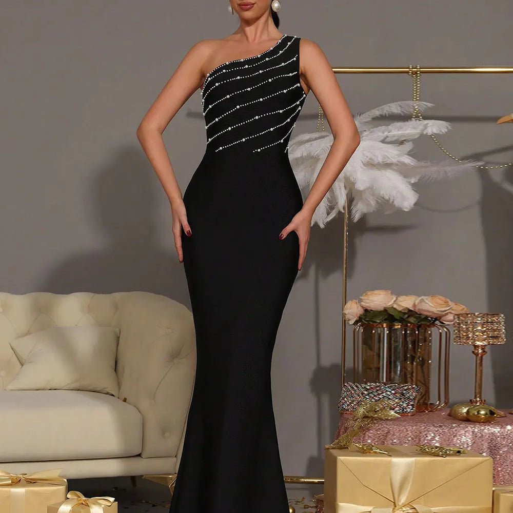 2025 Elegant Women Nail Bead Design Bandage Dress One Shoulder Sleeveless Bodycon Long Dress Cocktail Evening Club Party Vestido