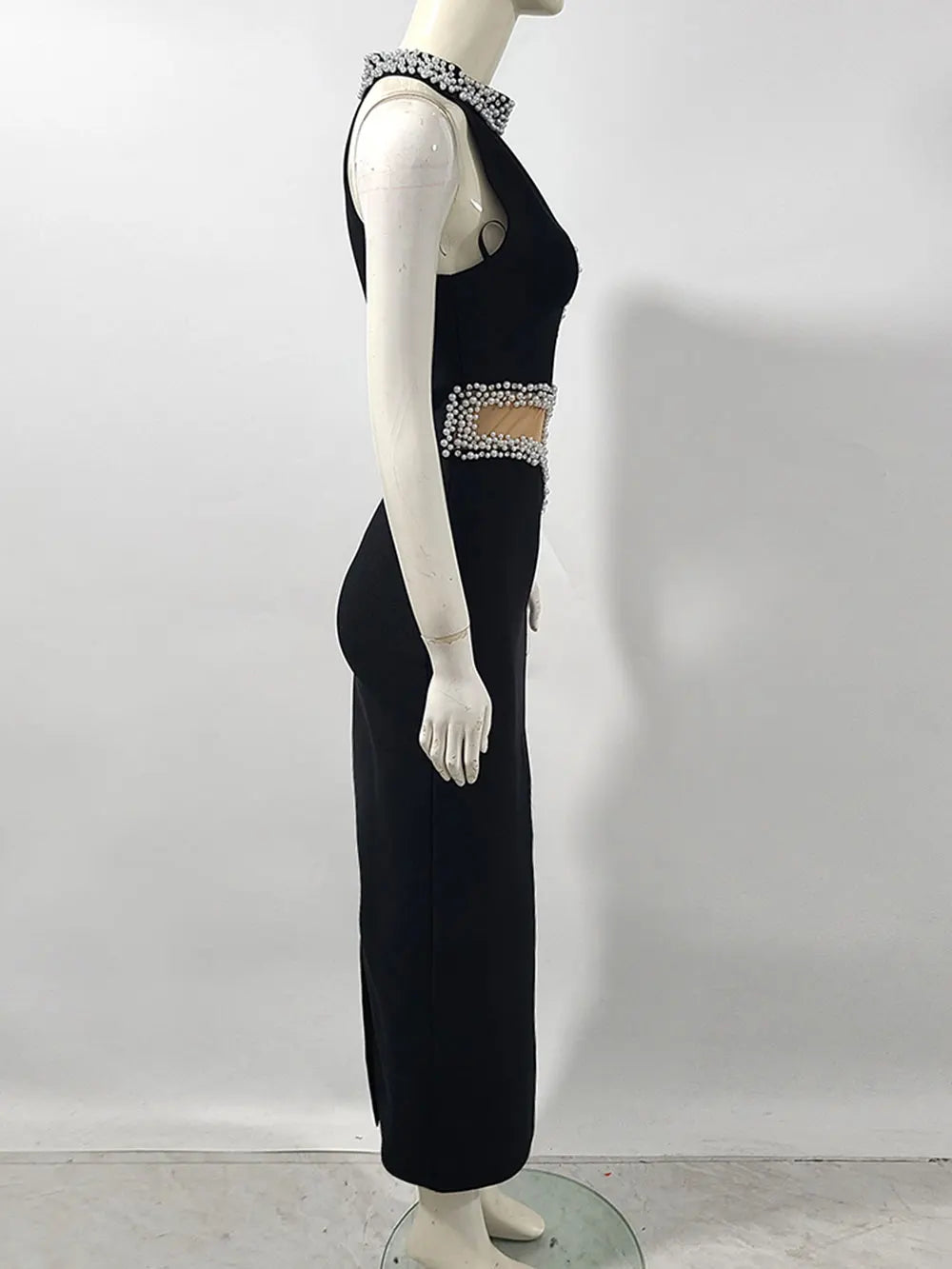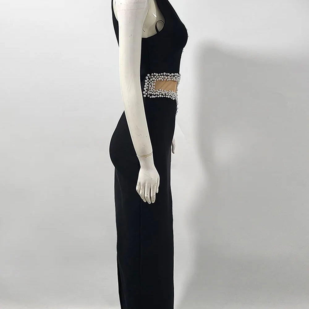 2025 Elegant Women's Light Luxury Nail Bead Patchwork Design Bandage Dress O-Neck Sleeveless Bodycon Long Dresses Party Vestidos