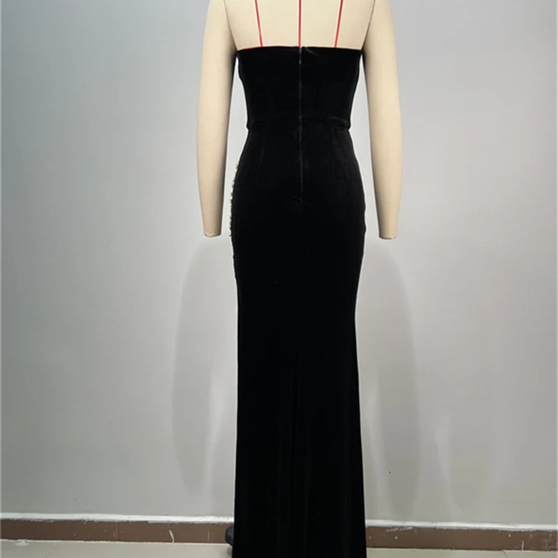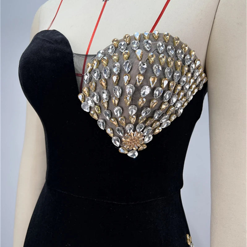 2025 Luxury Shining Diamonds Sexy High Slit Stapless black velvet Long Dress Elegant Woman Birthday Party Dress Goddess Vestido