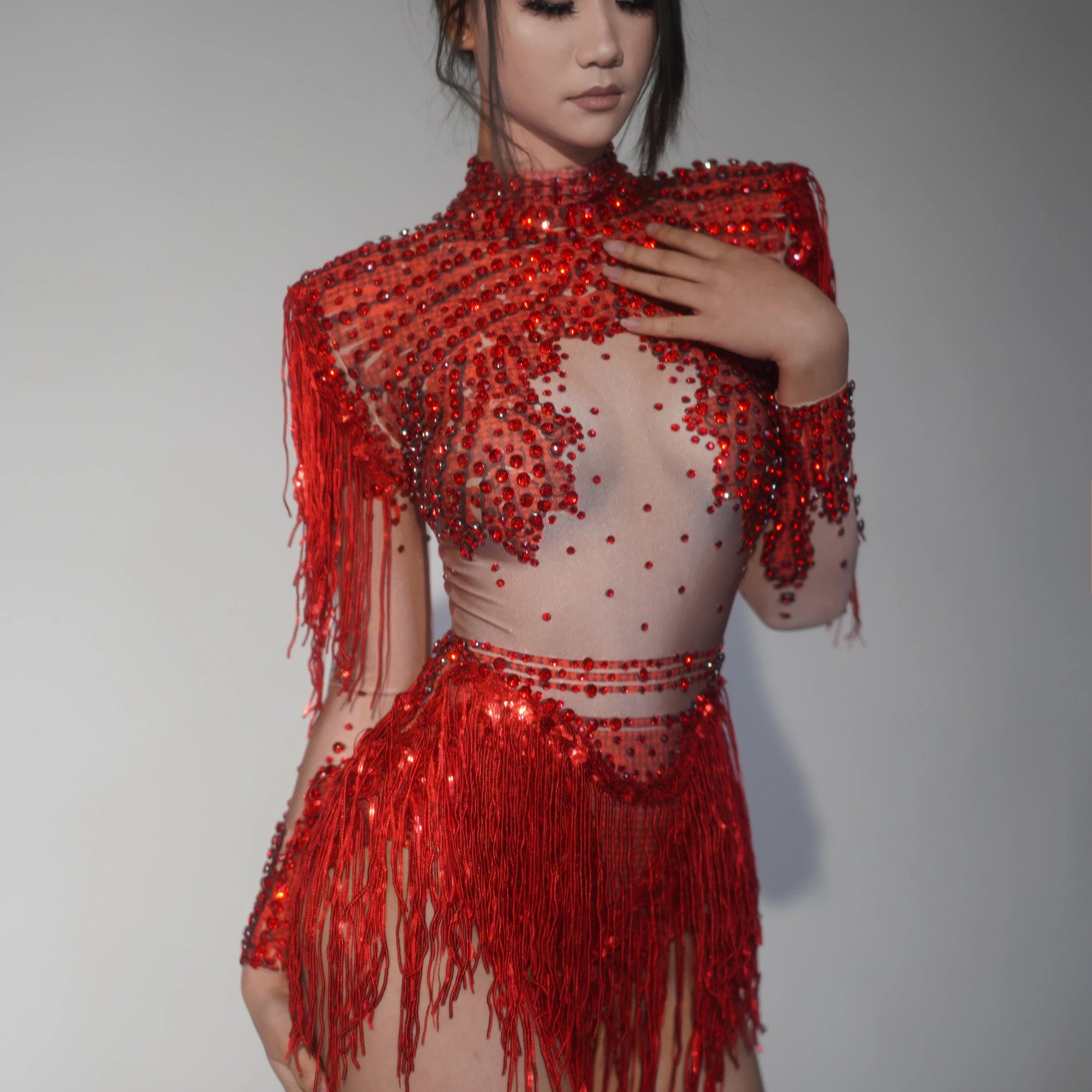 2025 Nova Chegada Brilhante Strass Lantejoulas Borla Stretch Bodysuits Mulheres Festa de Aniversário Boate DJ Palco Performance Traje