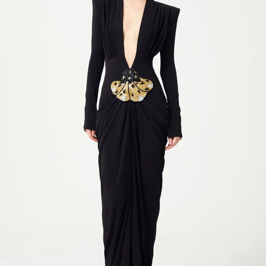 2025 New Beaded Decoration Sexy V-Neck Package Hip Black Floor Length Dress Celebrity Party Dress Woman Cocktail Outfit
