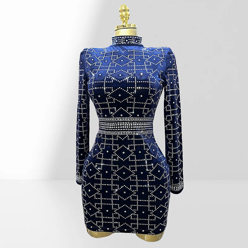 2025 New Dark Blue Velvet Luxury Diamonds O-neck Tuck Waist Mini Dress Fashion Woman Party Dress Celebration Birthday Vestido