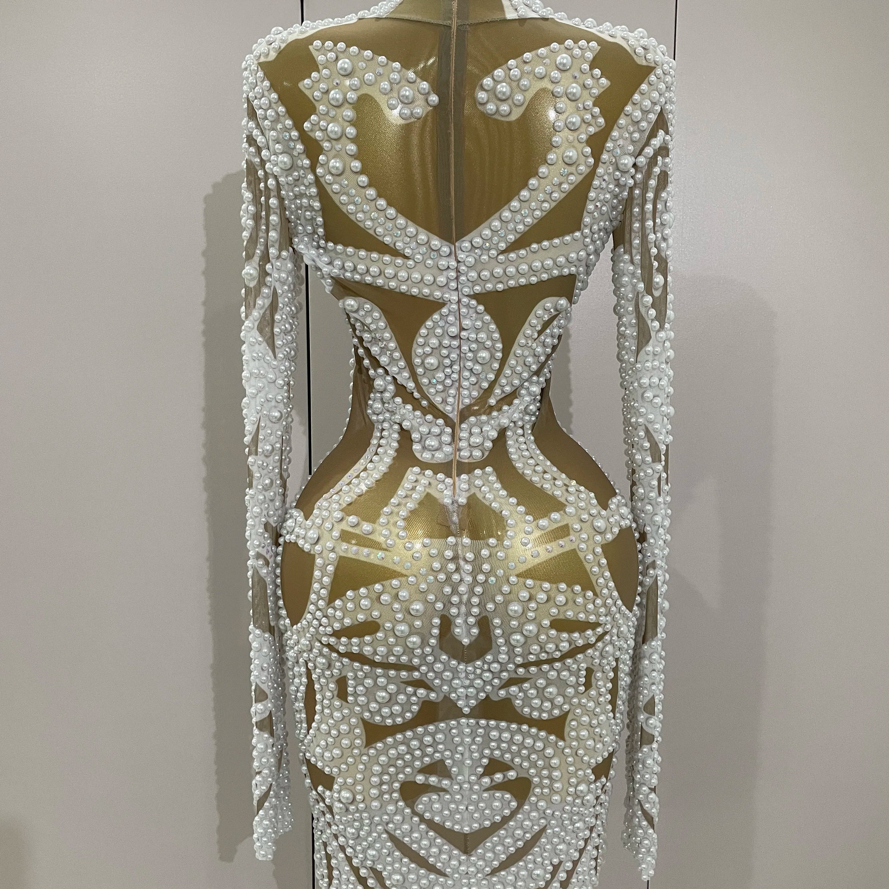 Vestido de noite elegante e de alta qualidade 2025 AB com strass e pérolas, vestido de malha de mangas compridas luxuoso para mulheres, coquetel, festa de casamento