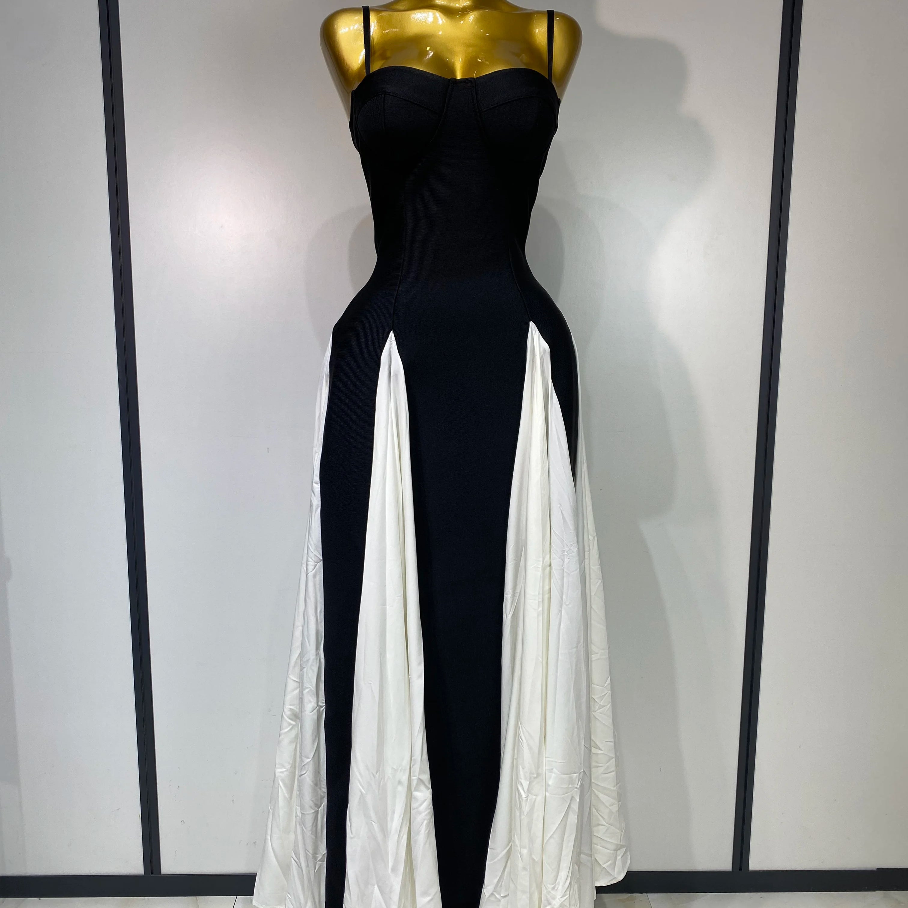 Vestido longo feminino de cor contrastante 2025, elegante, sem mangas, costas nuas, cintura alta, bandagem, vestido de festa para rua alta