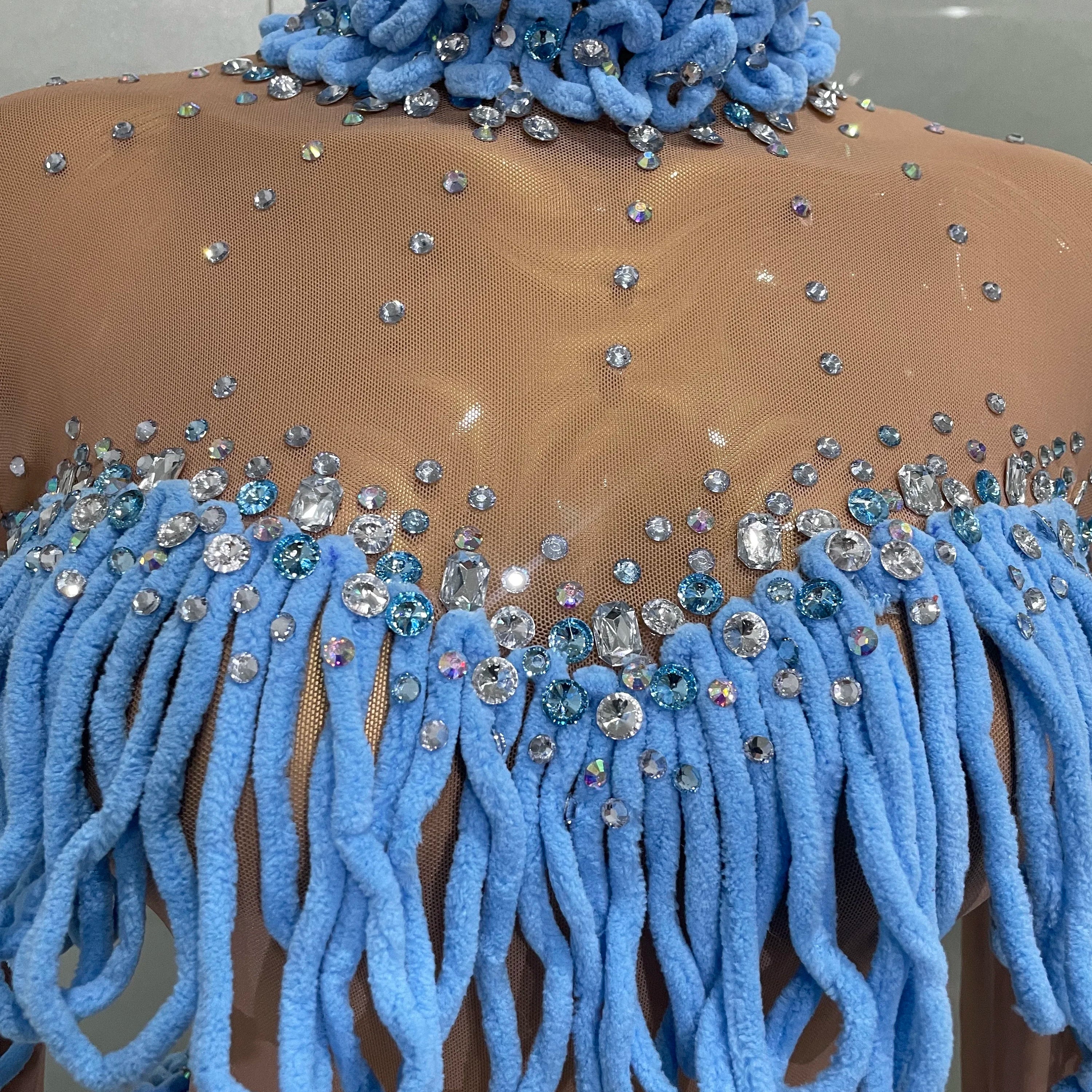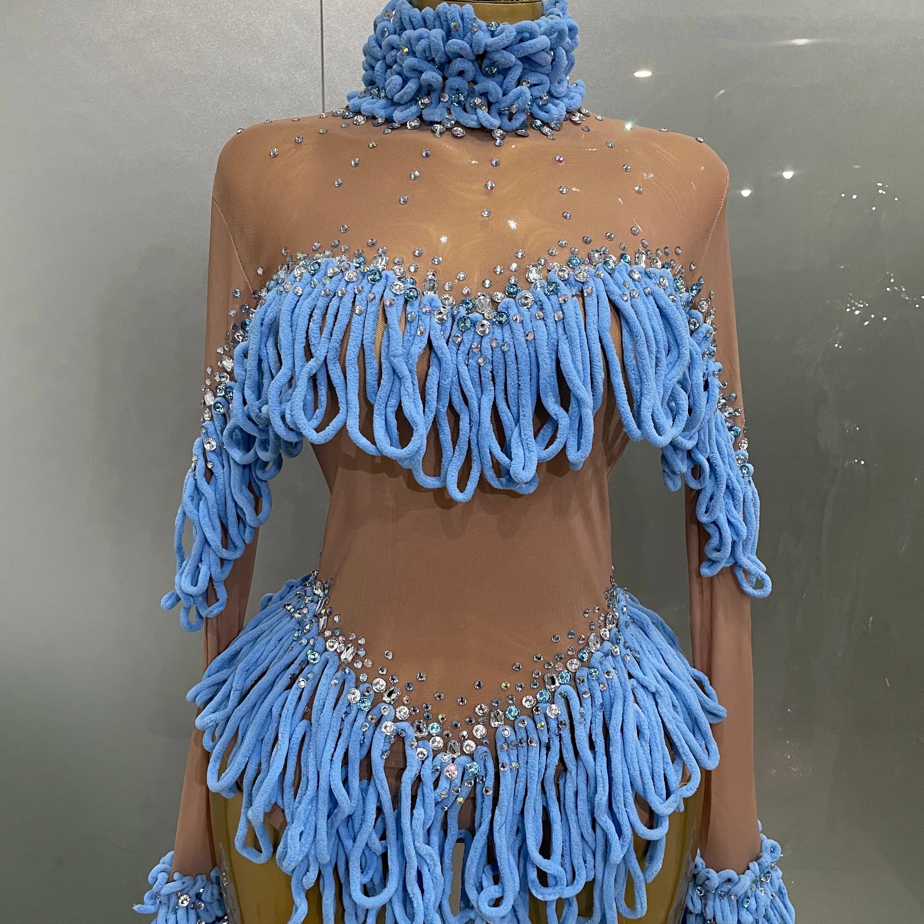 2025 Novo Body Feminino Brilhante com Strass e Borlas em Malha Sexy para Festa de Aniversário, Clube, Dança, DJ, Collant, Show, Palco