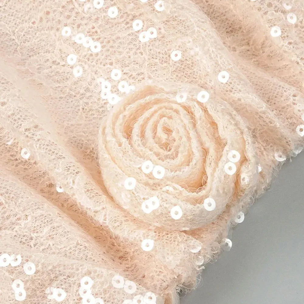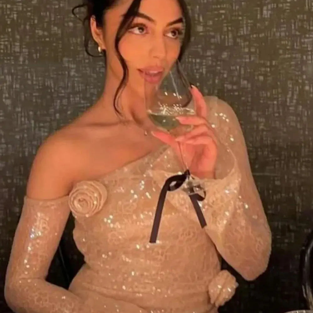 2025 Sexy Women's 3D Flower Shining Glitter Maxi Dress with Diagonal Collar Long Sleeve Bodycon Long Dress Evening Club Vestidos