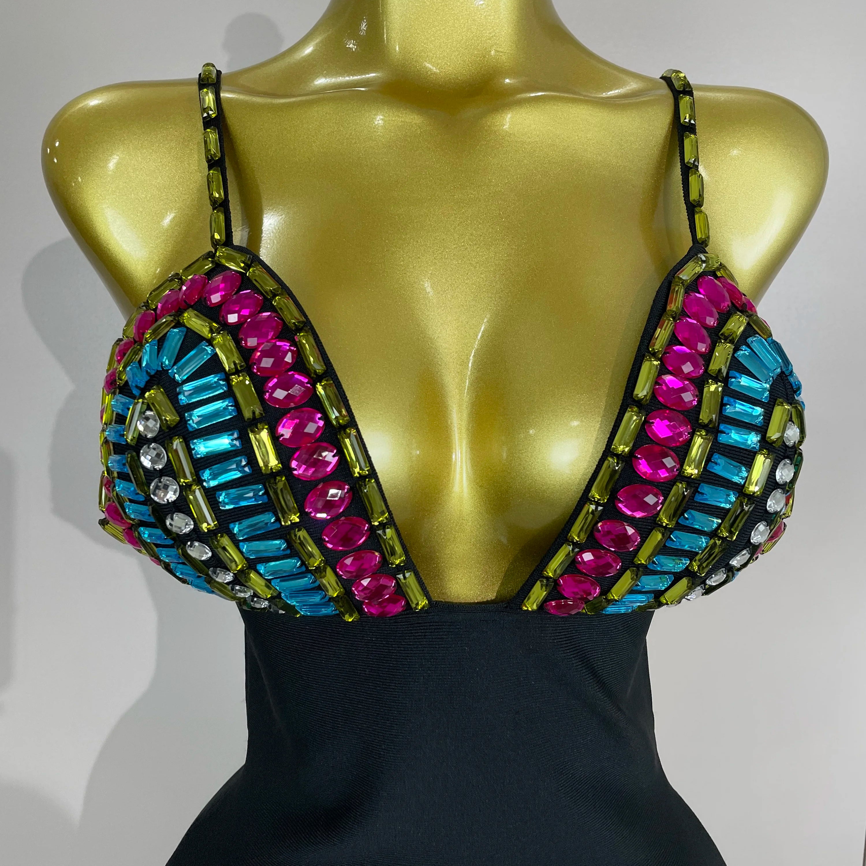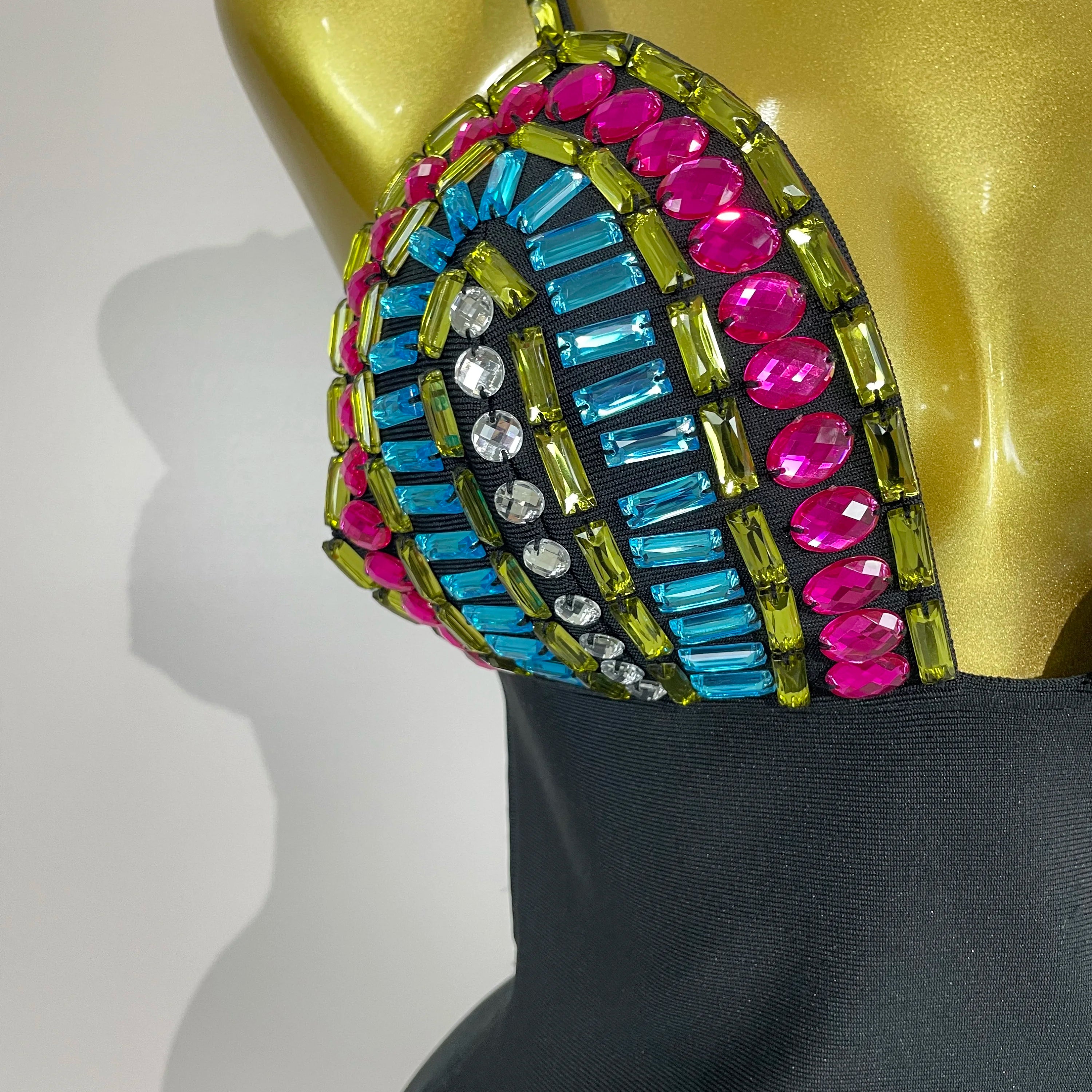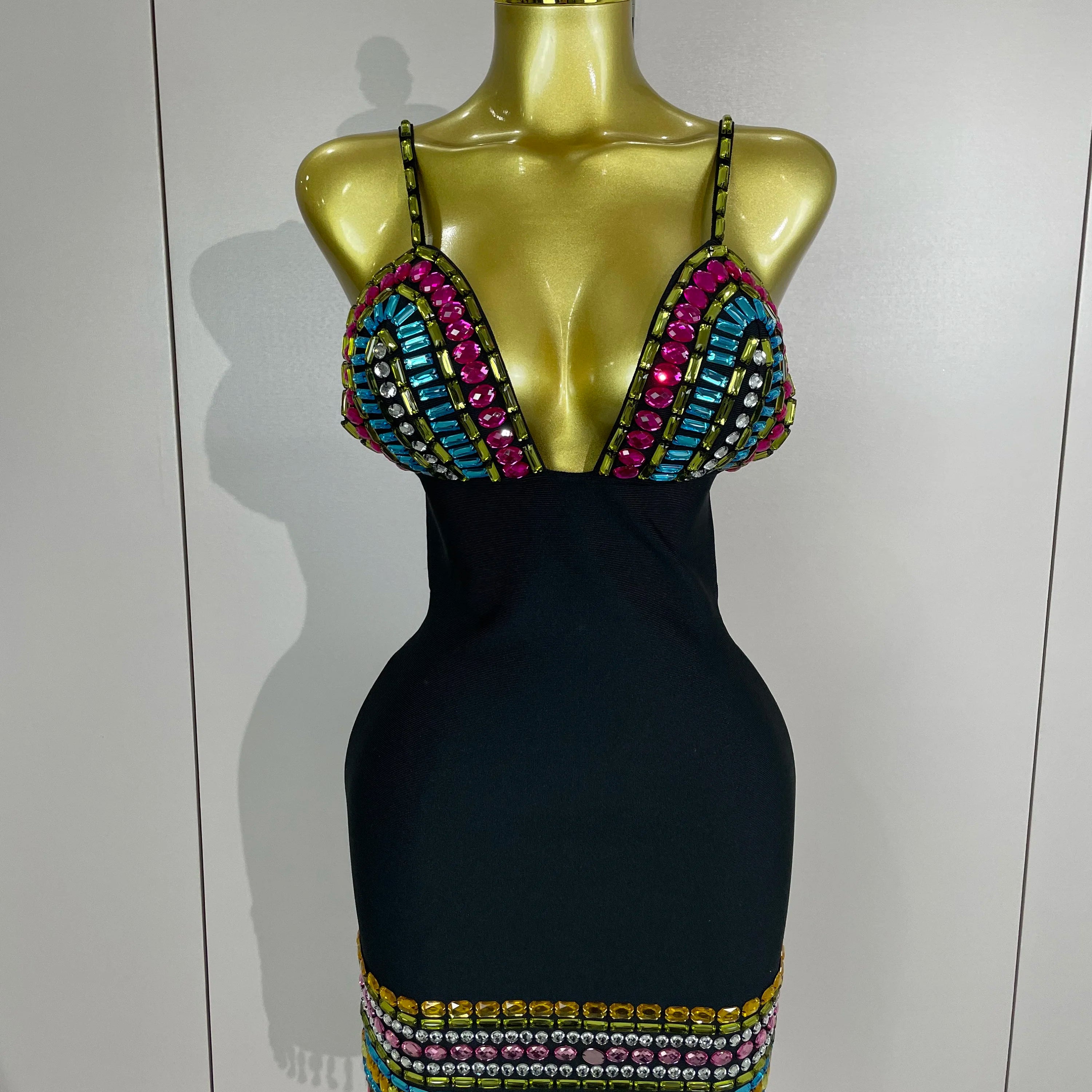 Vestido bandage preto colado ao corpo com diamantes brilhantes e coloridos 2025, elegante para festa noturna em boate, vestidos de aniversário luxuosos