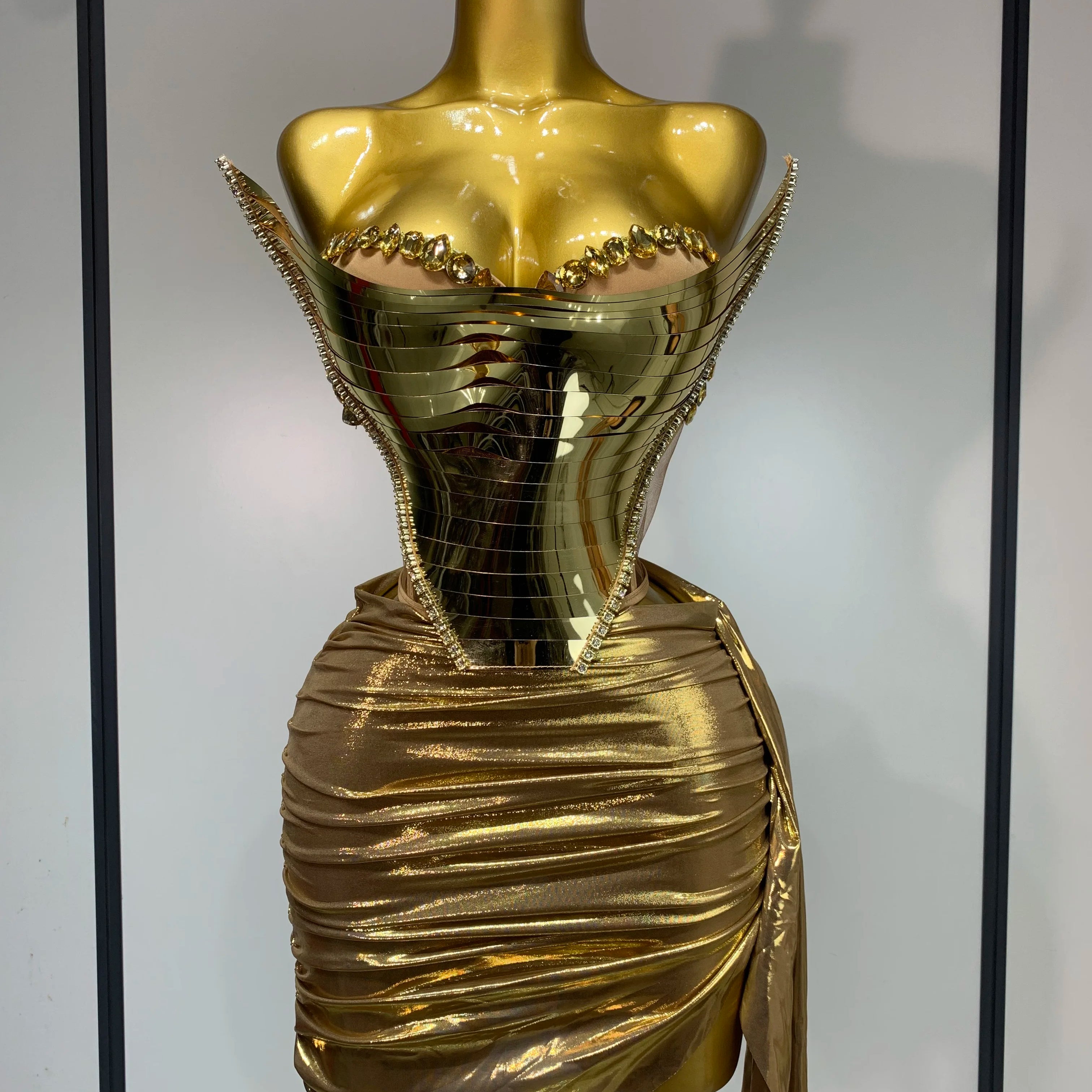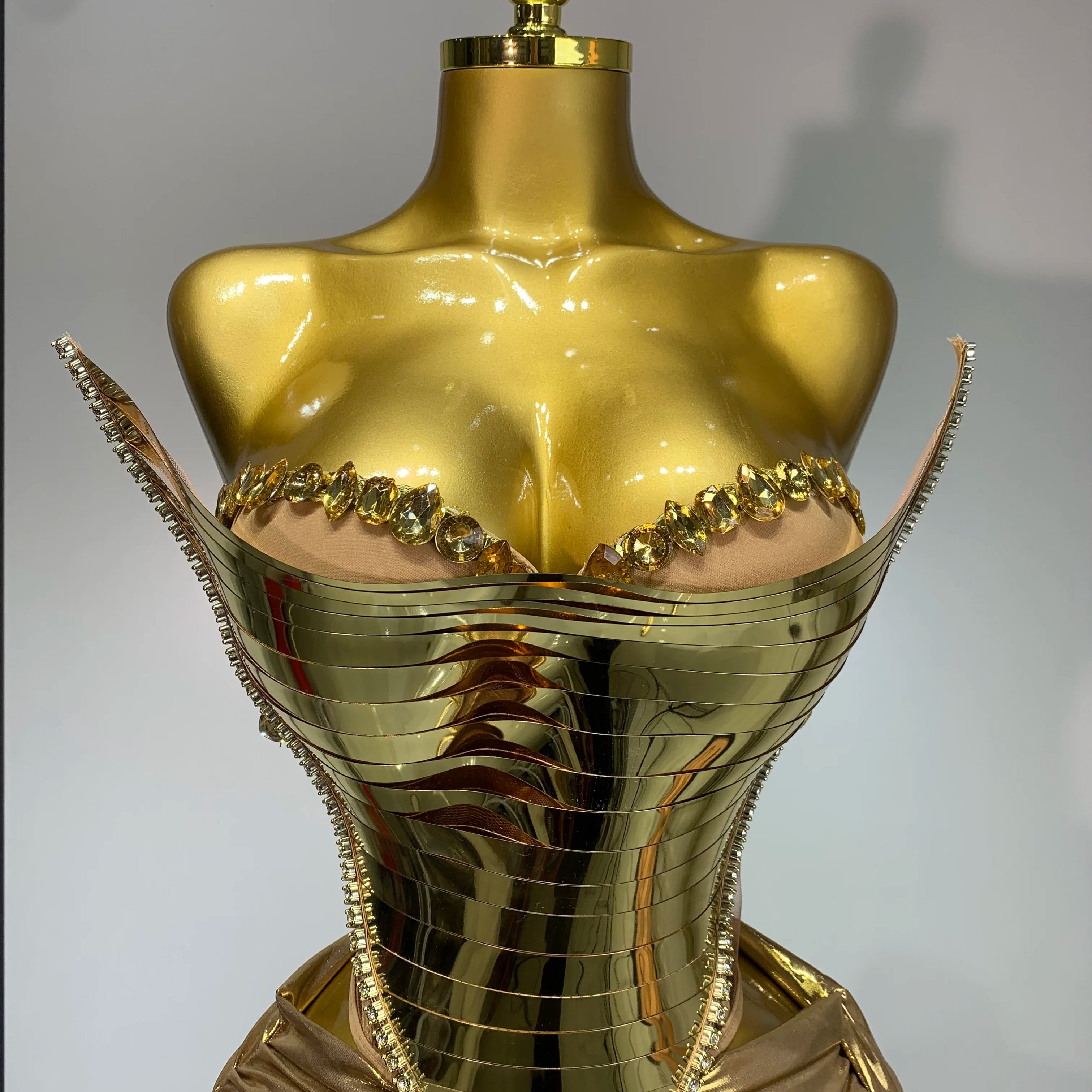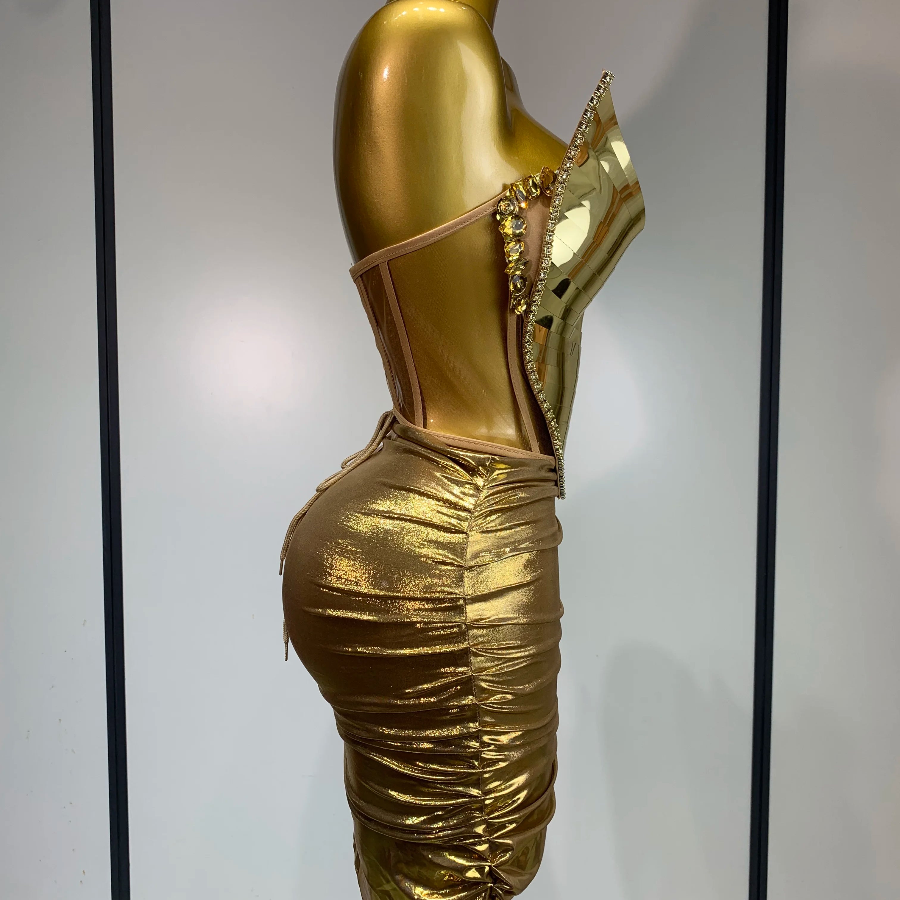 Conjunto de duas peças de top sexy com lantejoulas douradas brilhantes 2025 para mulheres, comemoração de festa, aniversário, boate, performance, dançarina, show, roupa de palco
