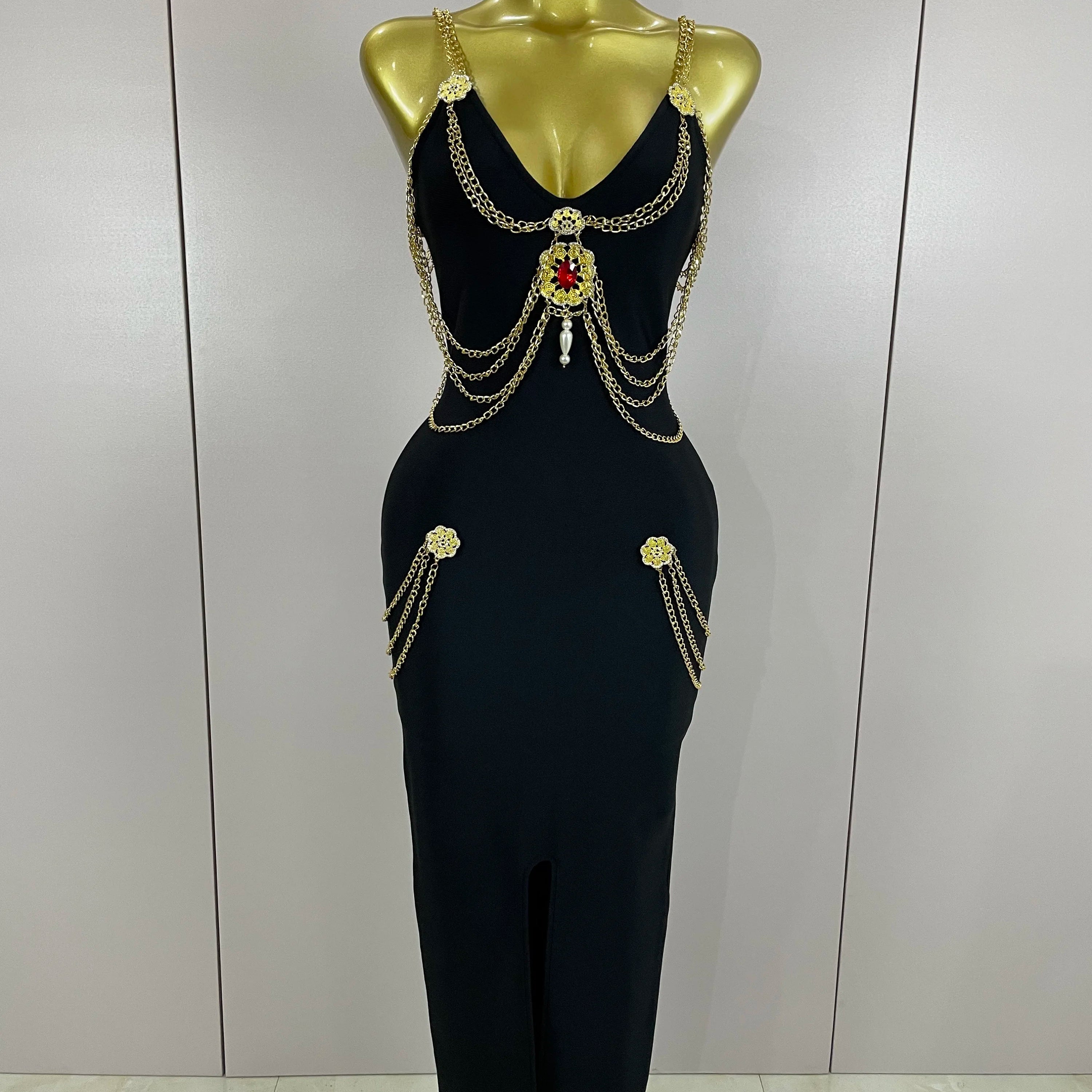 Vestido longo de alta qualidade 2025, novo, preto, com alças finas, decote em V, bandagem dividida, justo, para celebridades, clube, festa