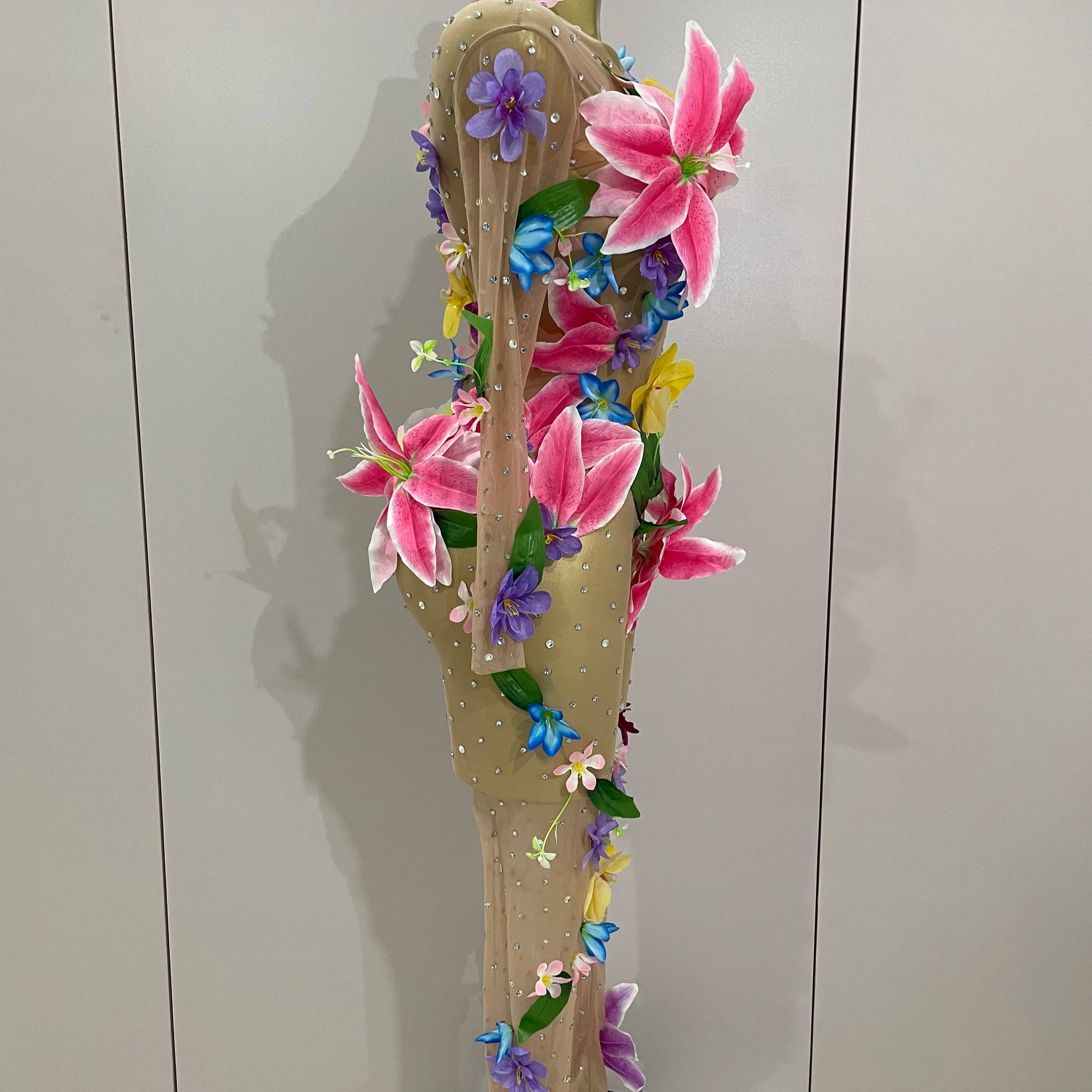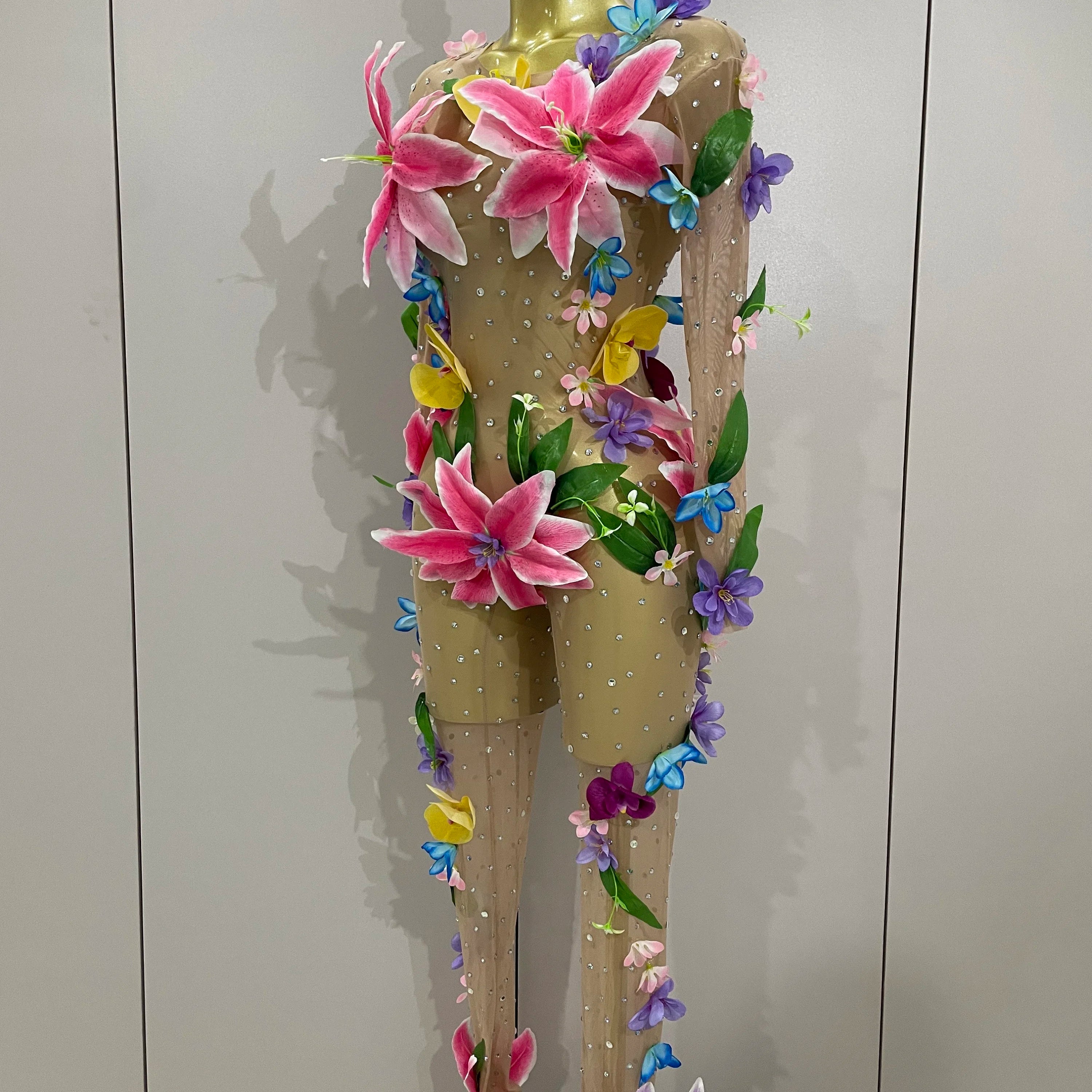 2025 Strass Brilhantes 3D Flor Nude Malha Transparente Macacão Feminino Festa À Noite Aniversário Boate Performance Palco Traje