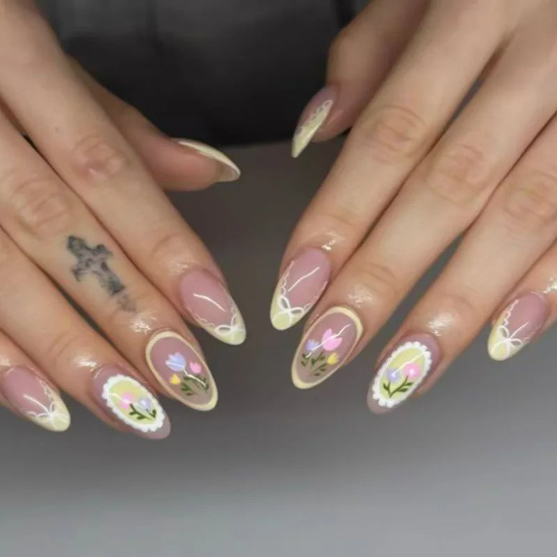 24Pcs Green French Press on Fake Nails with Almond Head Design 3D Flower Full Cover Nail Art Tips Short Round Head False Nails