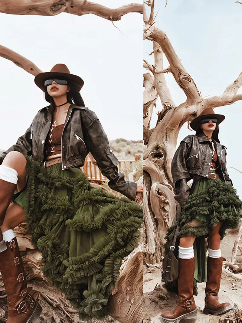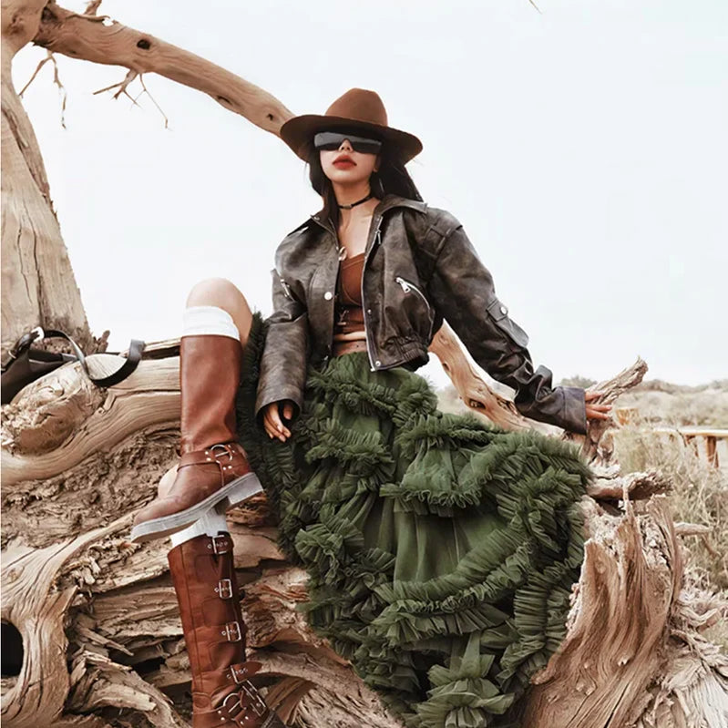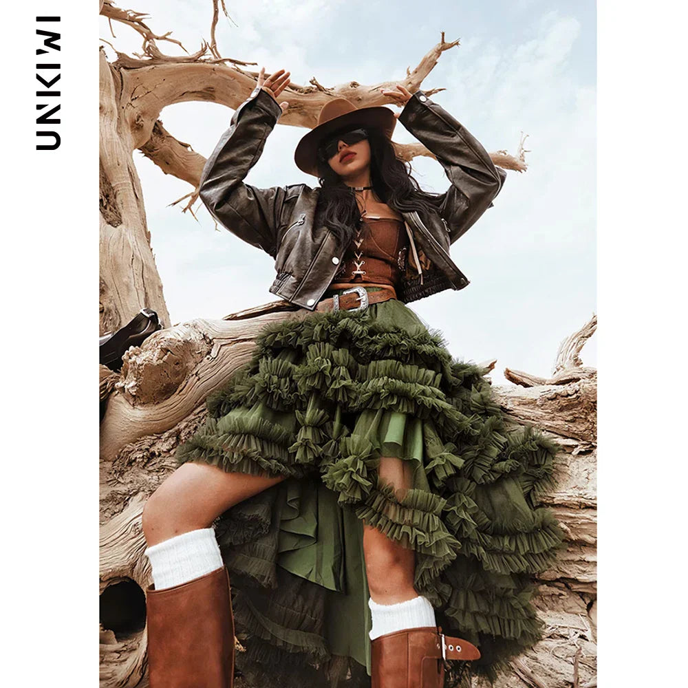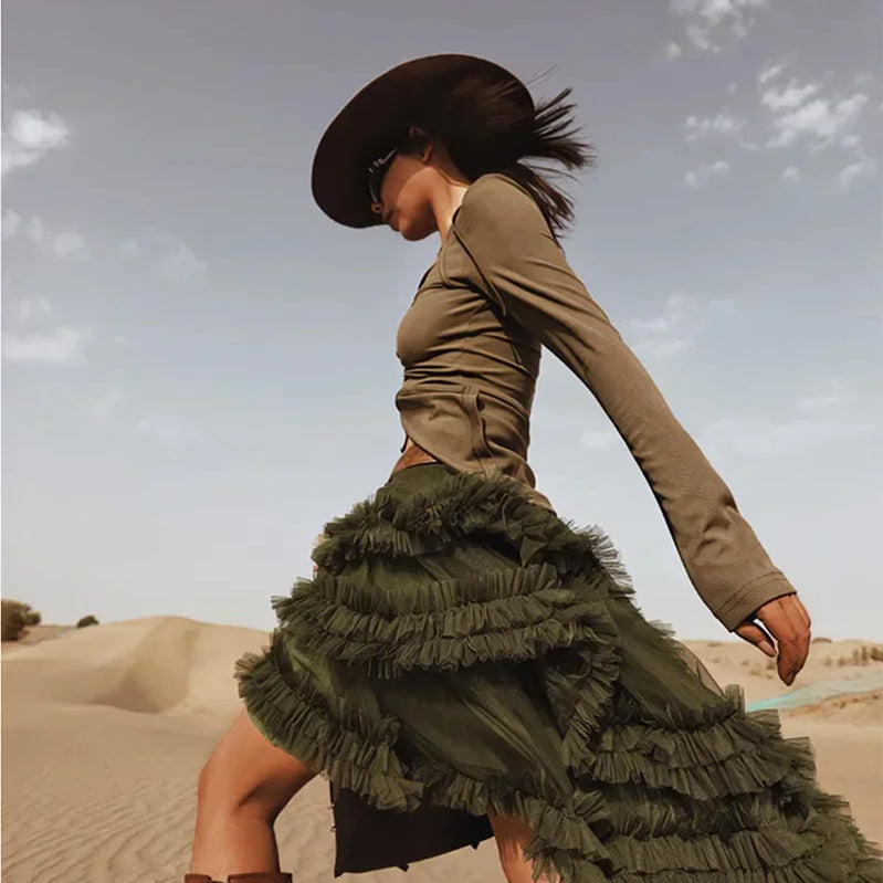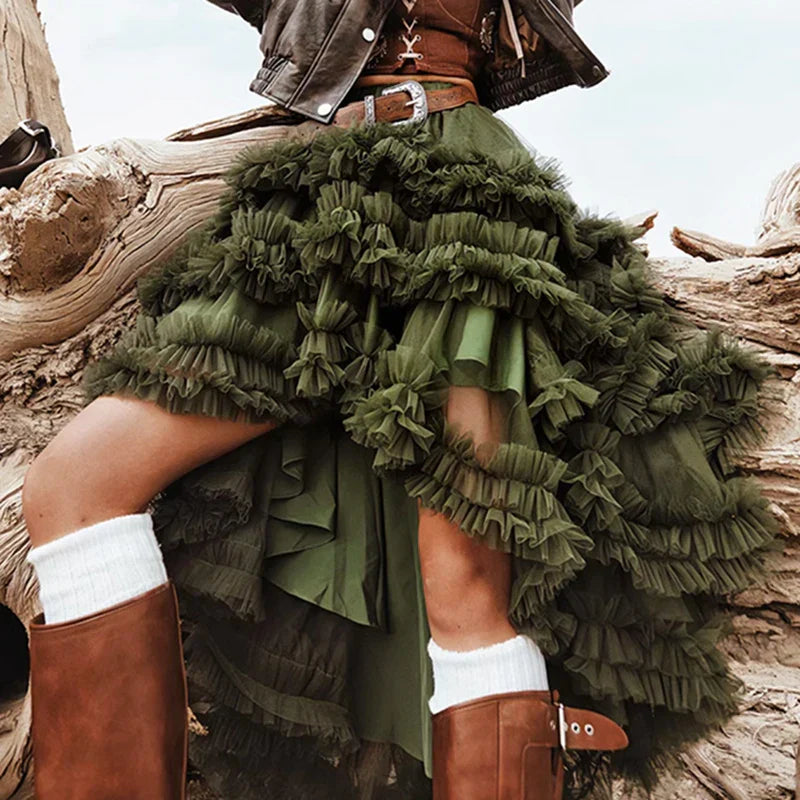 Saia longa feminina de 3 cores com bainha irregular e babados de tule, saia multicamadas, saia longa de gaze de fada, roupa feminina