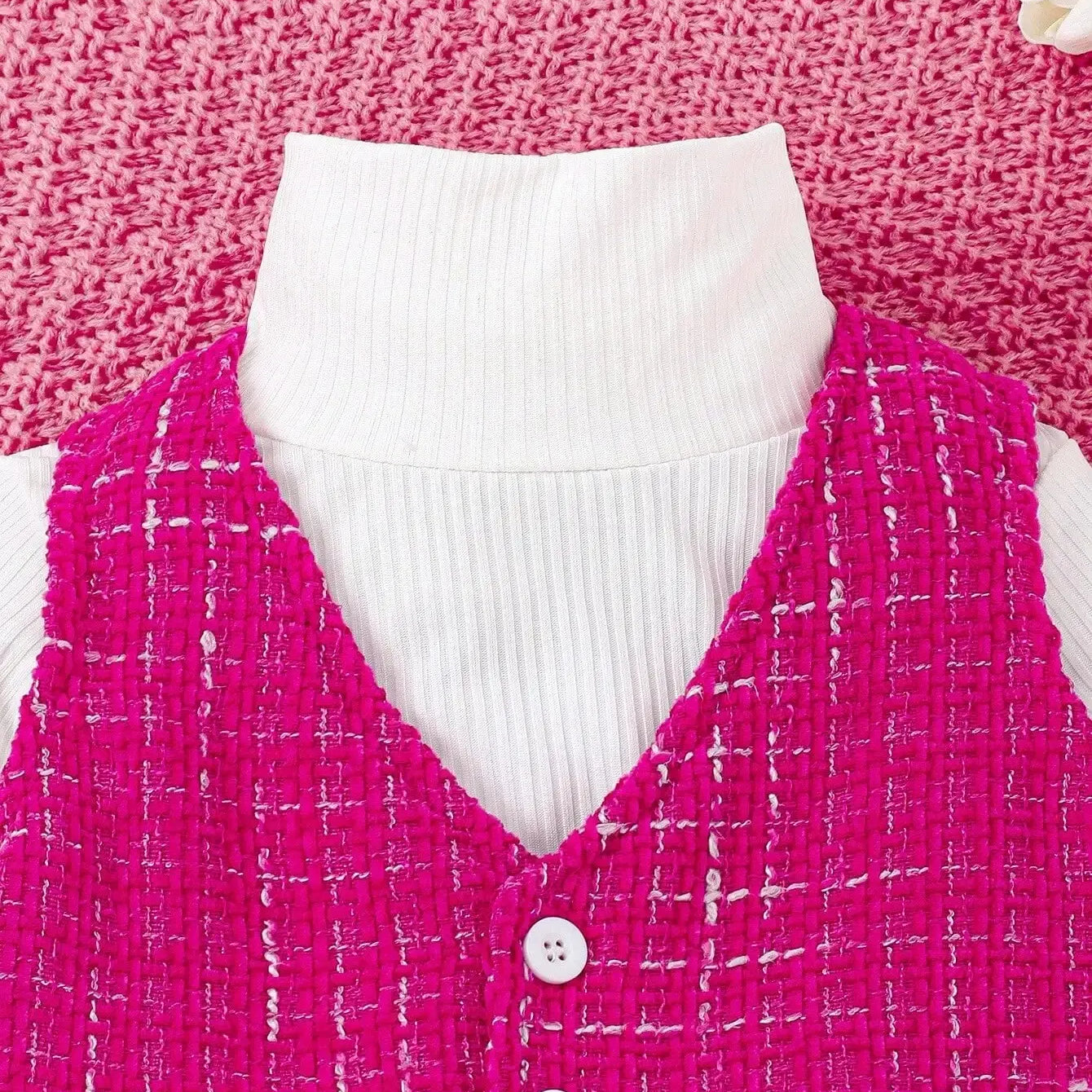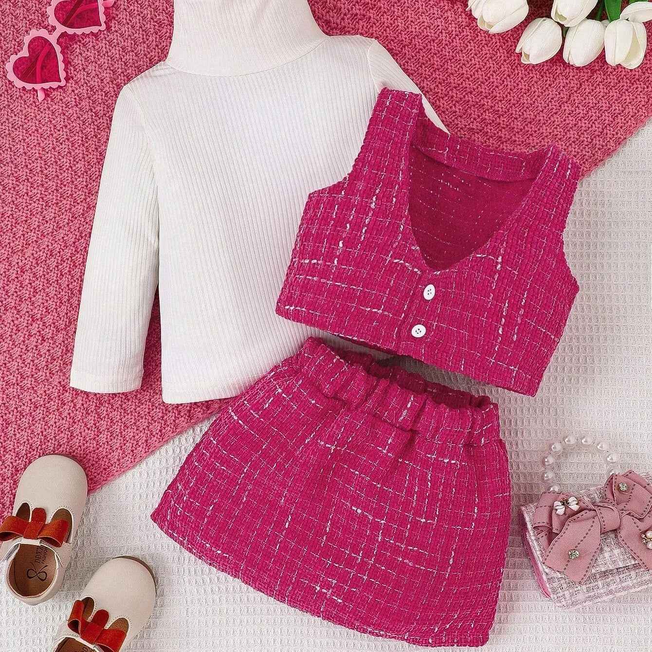 3 peças outono/inverno bebê menina bonito e doce estilo ocidental branco de manga comprida rosa vermelho colete e saia quente conforto terno