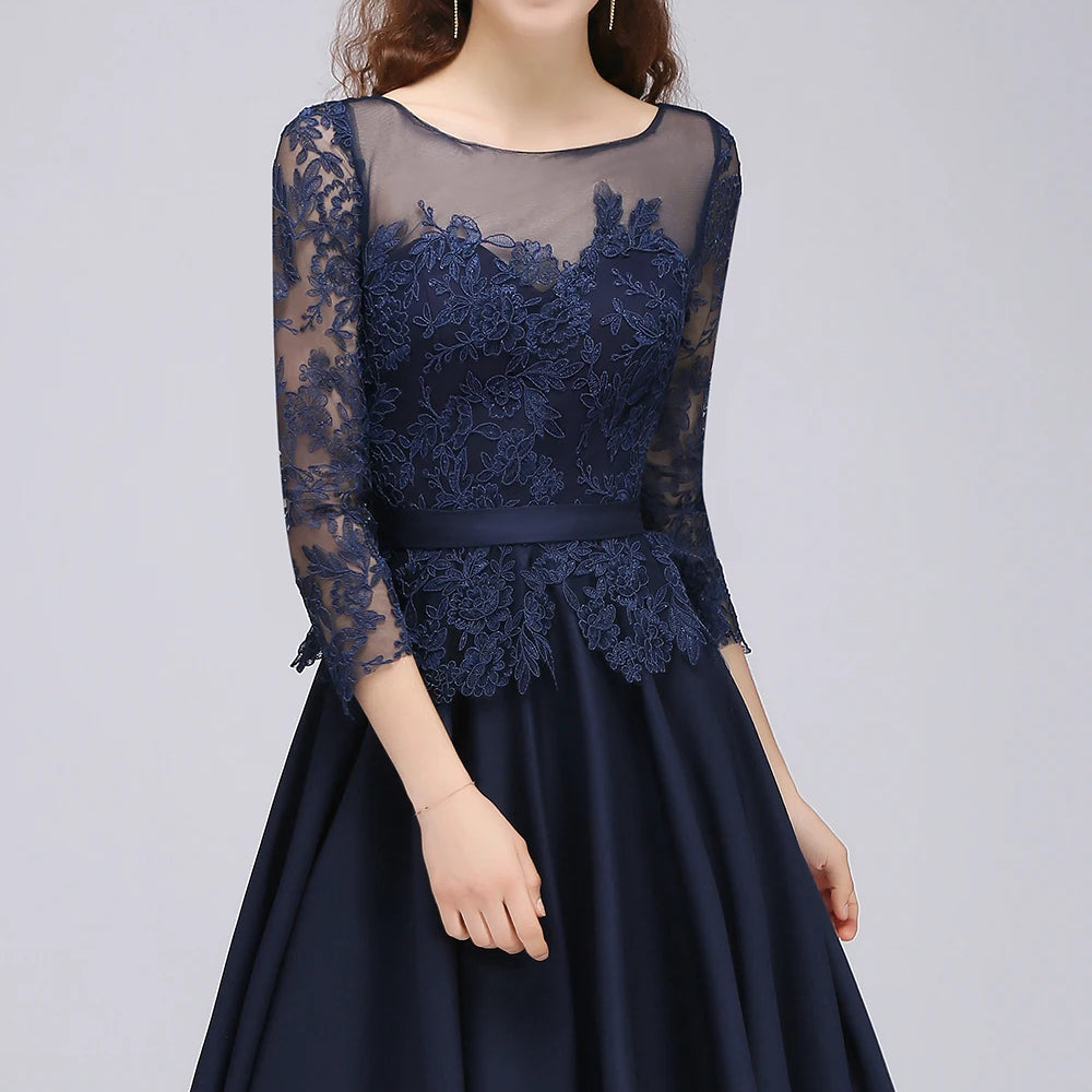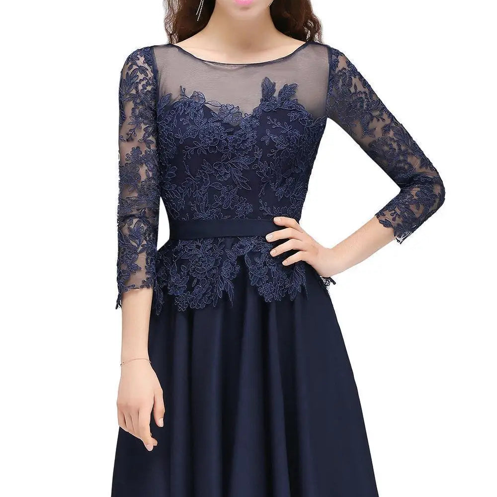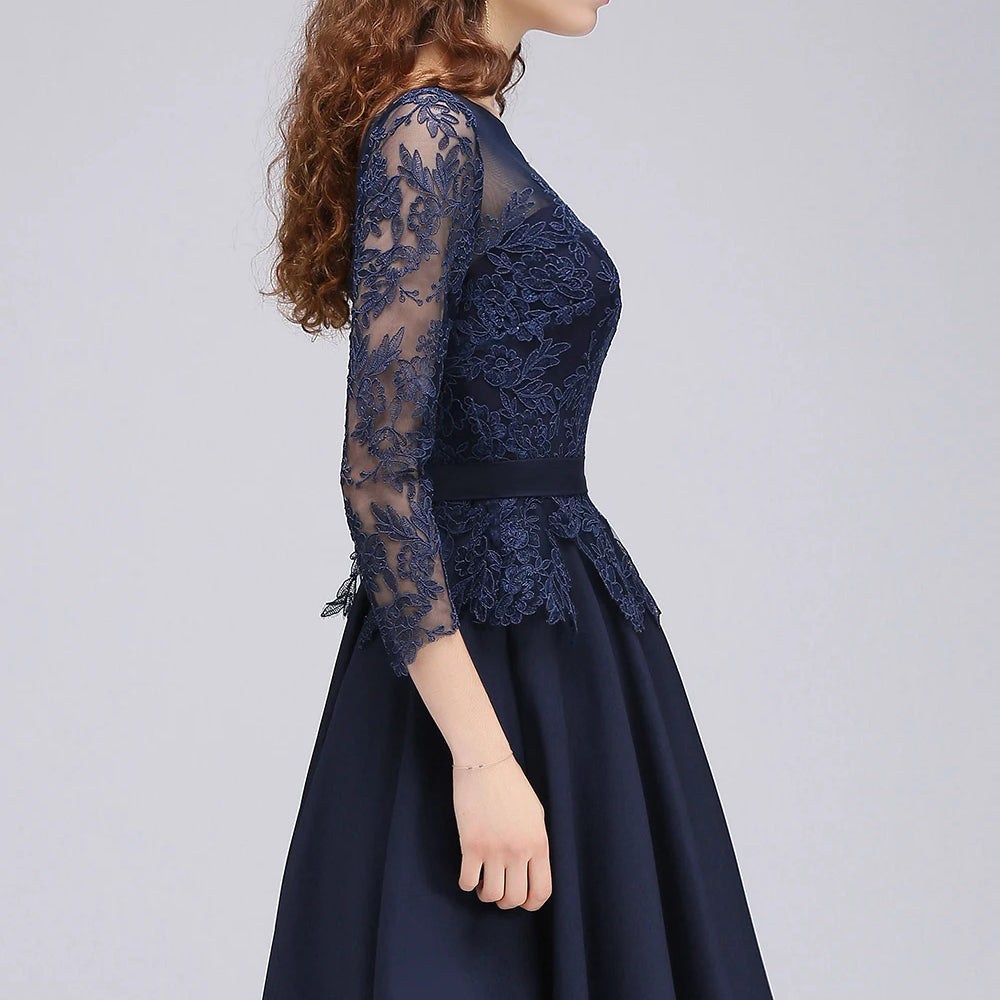 Vestido de festa curto com decote em A, mangas compridas, renda, chiffon, saia evasê, comprimento até o joelho, vestido formal para festa de formatura