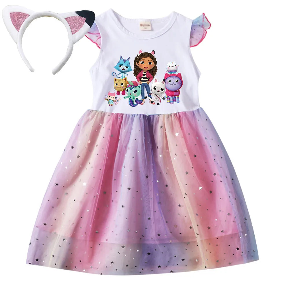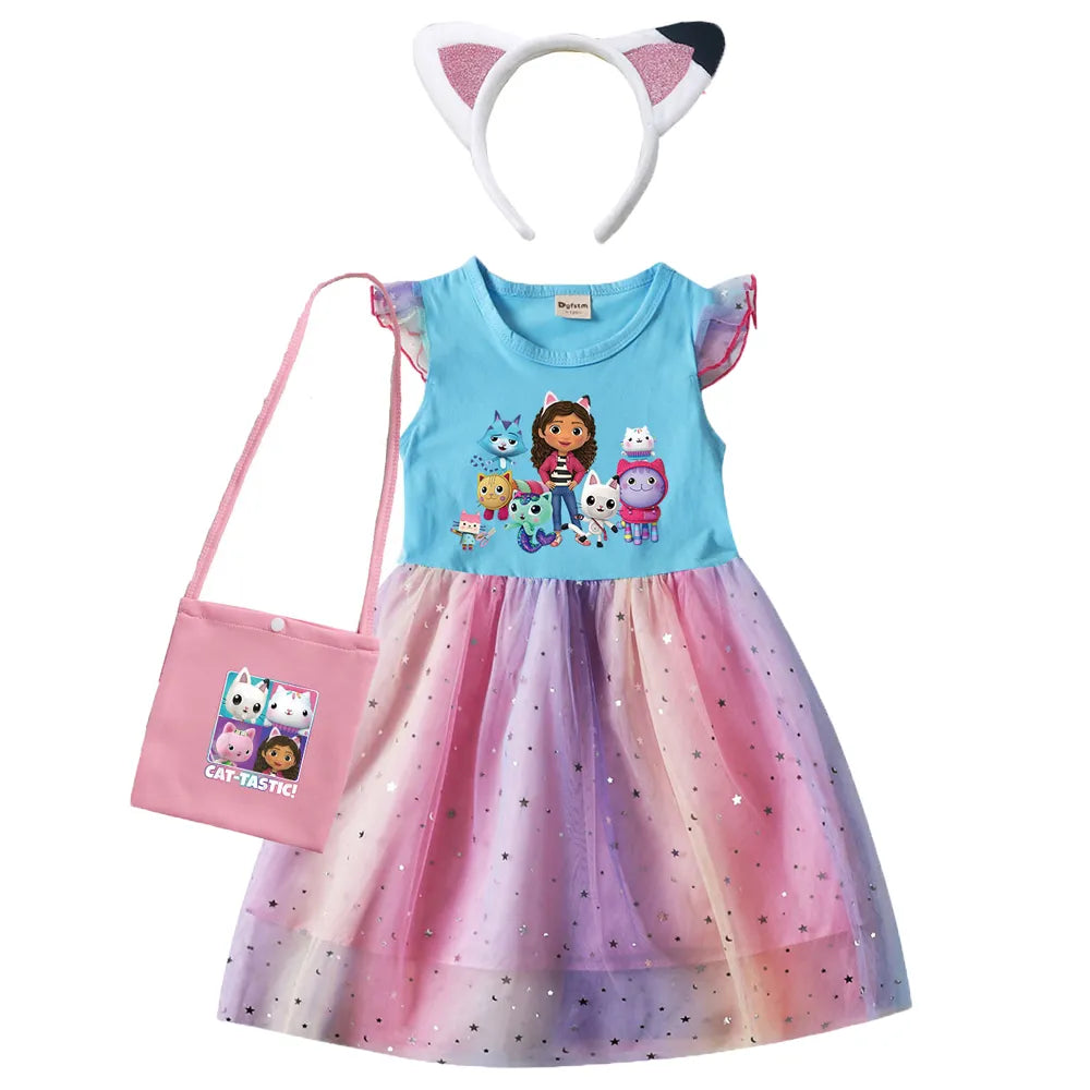 Adorável desenho animado gabby gatos manga voadora vestido de menina bebê com bolsa e faixa de cabeça fantasia cosplay de casa de bonecas infantil gabby